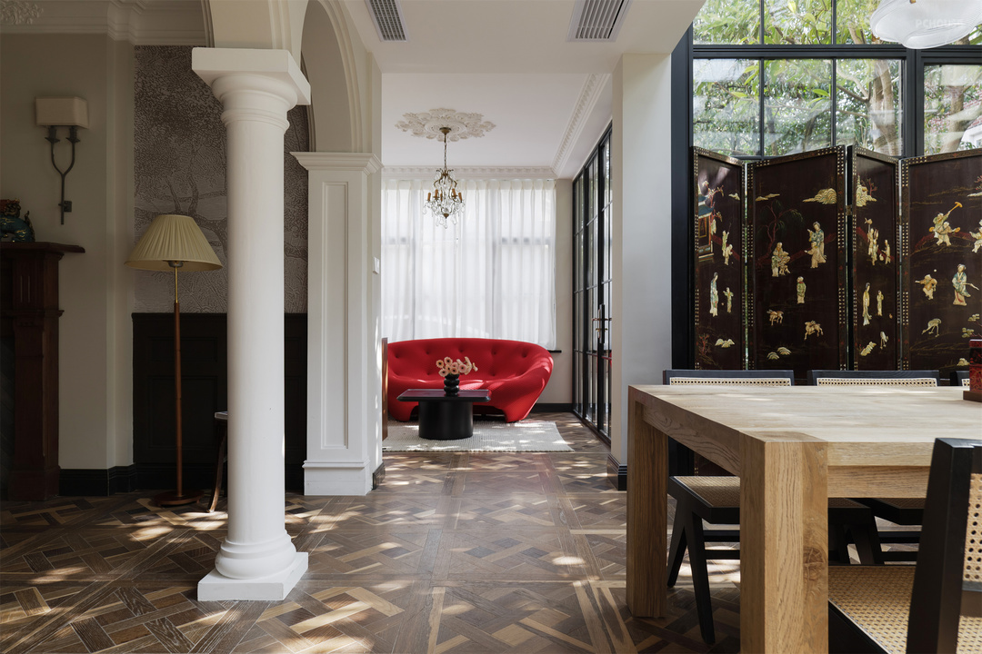 在家具软装层面,我们选用了部分古董旧物,有木胎黑漆螺钿镶嵌的回流古董屏风、老洋房里拆出并修复过的壁炉架、1910年代老上海Artdeco风格八角中央桌、法国运回的古董水晶灯及油画,搭配现代设计的沙发和桌椅,使新与旧相得益彰。
