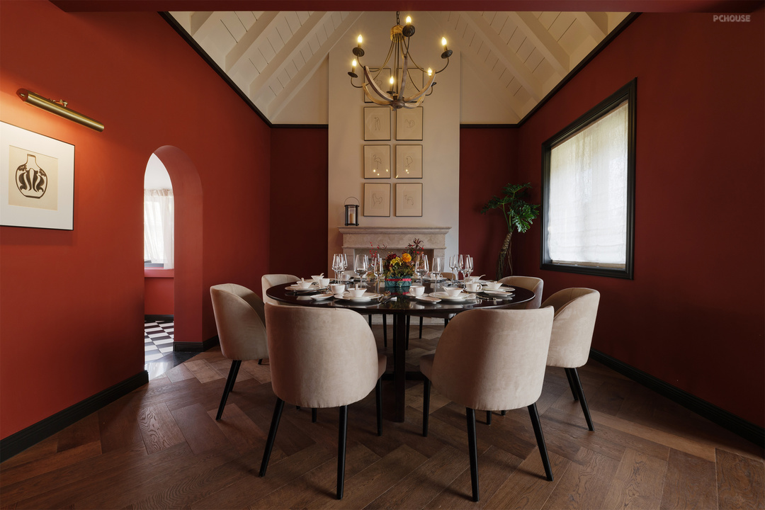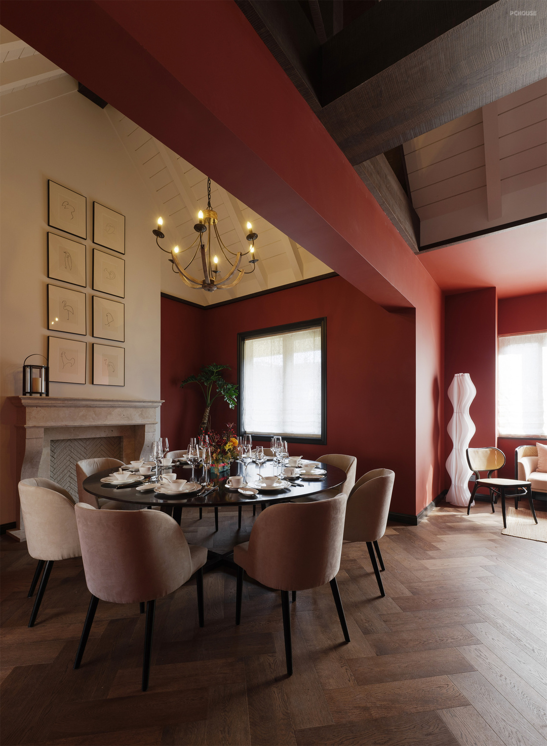 我们在三楼大包房选用了一种略微偏暖的大红色作为空间的主调。红色在中国传统文化里象征喜庆、热闹与祥和,将它与粗粝感的洞石壁炉、古朴感的深色木梁、沧桑感的木制铁艺吊灯、自然感的藤编沙发椅和亚麻窗帘搭在一起,达到了一种微妙的平衡,热闹感被弱化,祥和宁静感得到了突显。