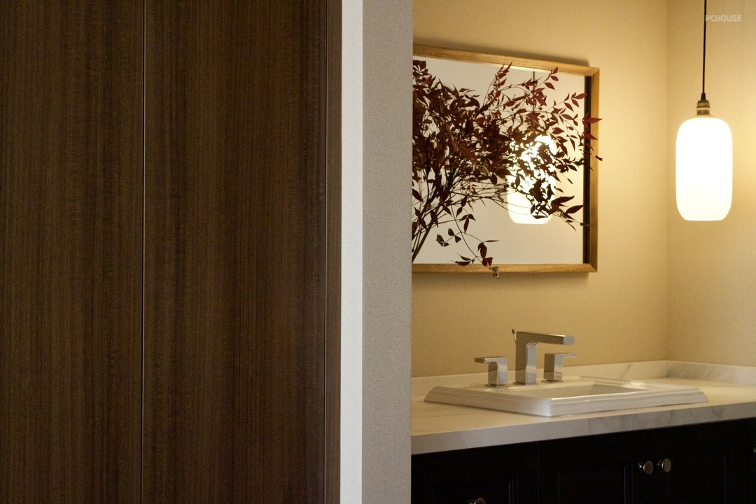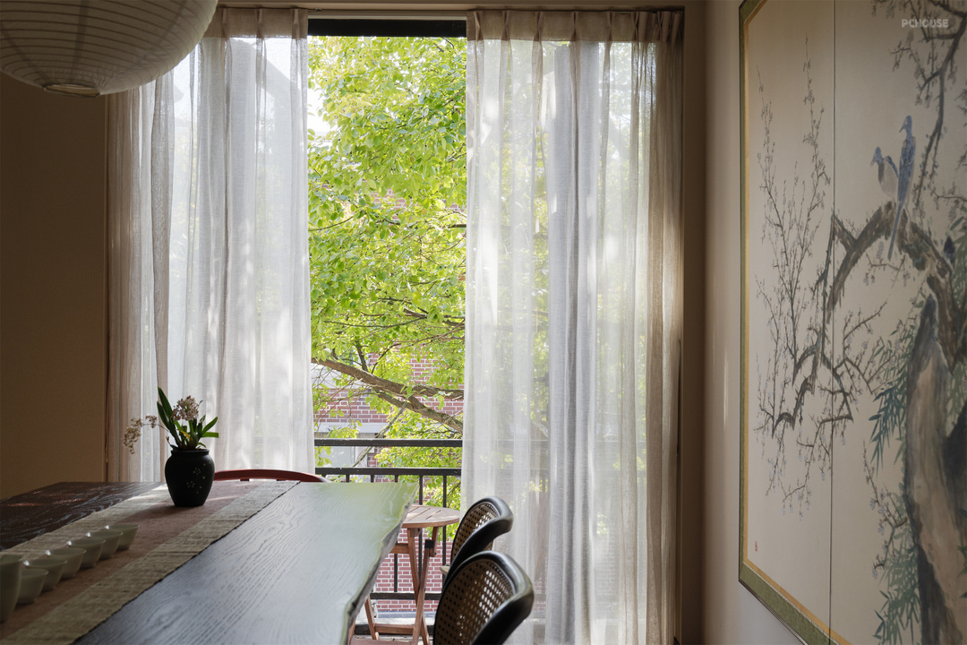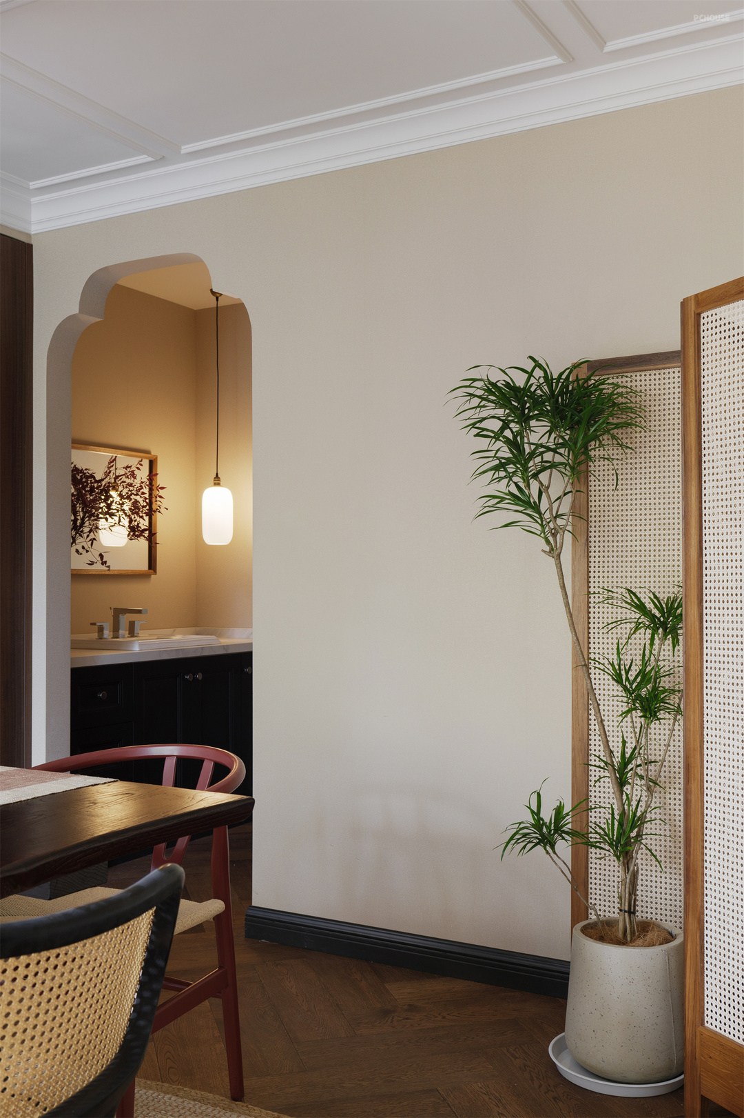 整个空间,我们延续了实木、藤编、亚麻等天然材料的运用来营造空间的朴素自然感,同时又结合了一些典型的东方美学元素,比如墙上的中式屏风、顶上的和纸吊灯、通往洗手区的中式门洞,来突显空间的东方气韵。 绿植的选择同样有讲究,细叶百合竹虽不是竹,却带着一丝竹的清雅,完美融入空间。