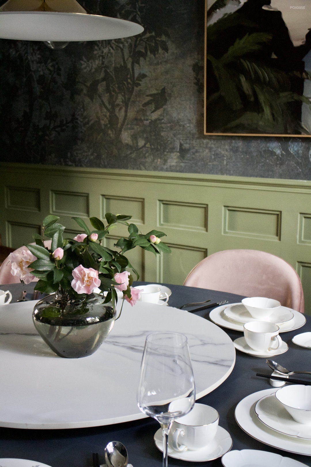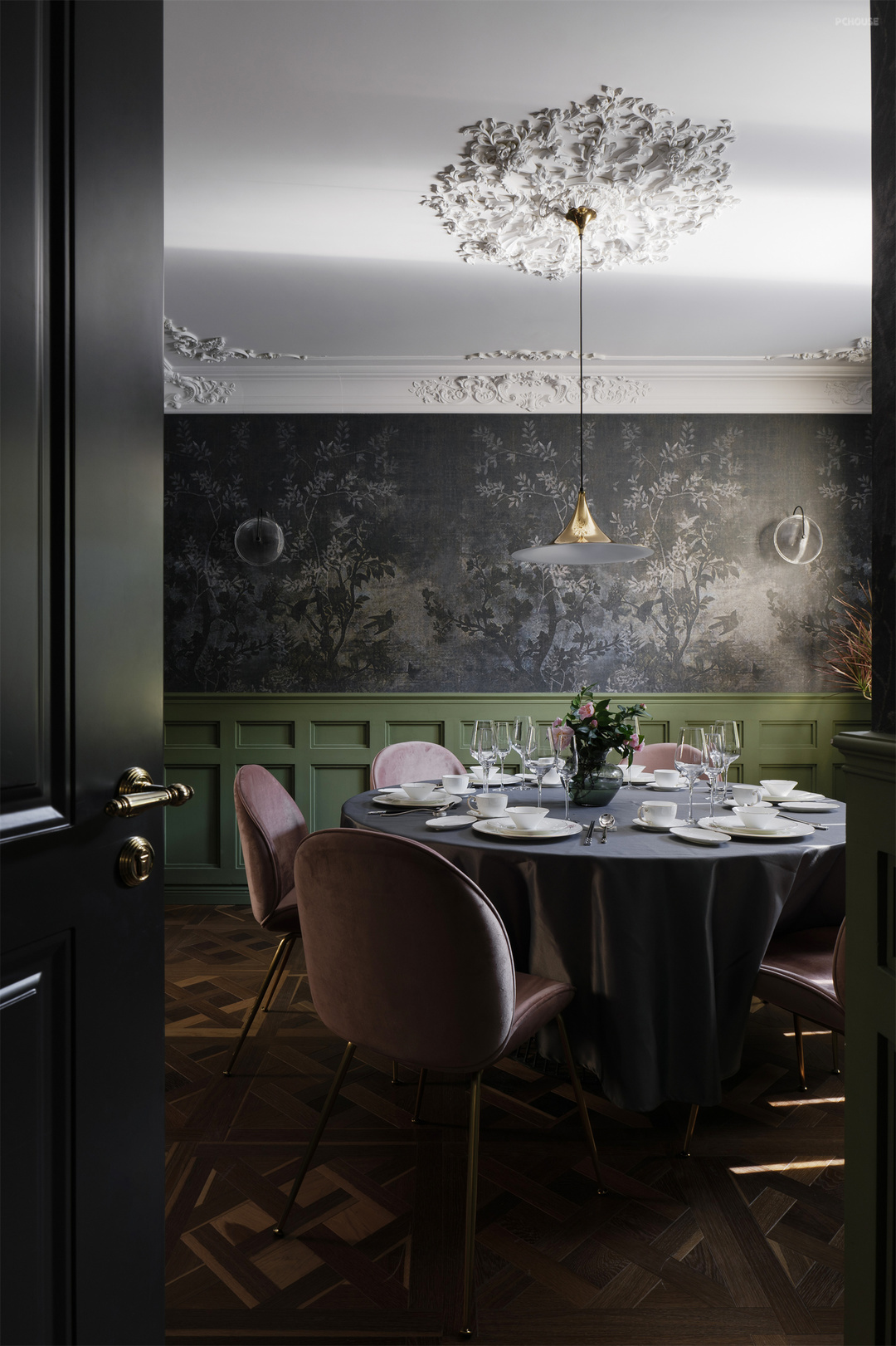 二楼小包房虽然小,却很别致,我们用了”对比“的手法来构建空间的审美层次。比如最繁复的古典石膏雕花搭配最简洁的现代设计吊灯;大面积的灰暗绿色搭配小面积的粉色。
