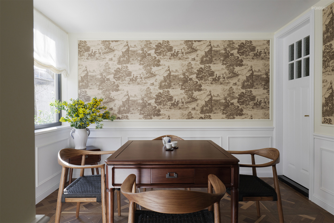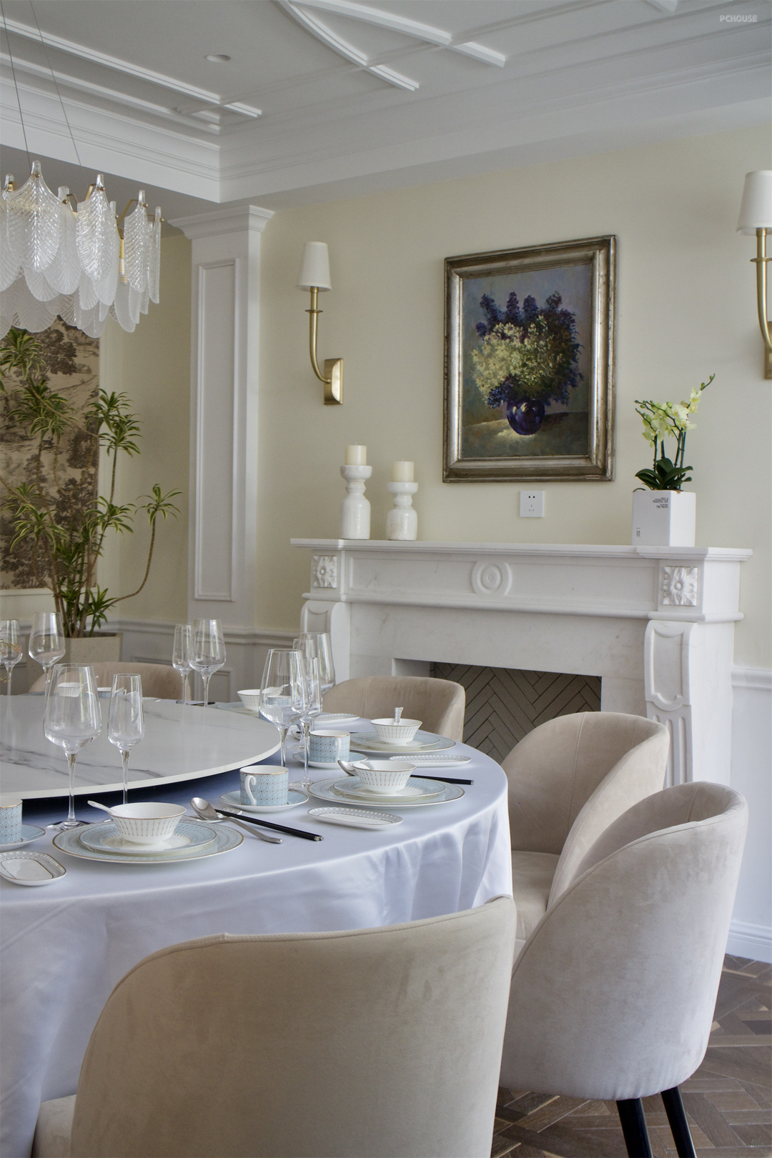 二层大包房是最大的一间,除了可以容纳最多14个人就餐,还有专门的麻将区。 我们选用了奶黄色作为空间主色调,搭配欧式手绘墙纸、白色大理石壁炉、水晶吊灯、胡桃木色家具,给空间奠定了一种精致优雅、端庄大气的氛围。