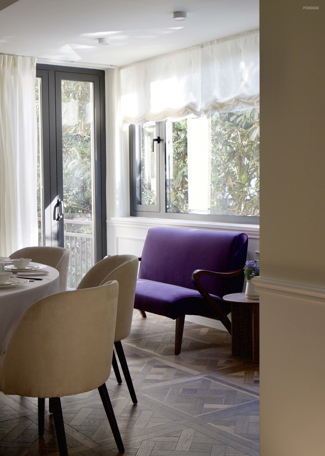 当然也少不了古董旧物的参与,壁炉上的古董花卉油画来自奥地利1930-1950年代,窗前休息区的深紫色丝绒沙发是经过翻新的上海老家具,典型的海派风格。油画的主色调为嫩黄色与深紫色,既呼应了沙发的颜色,也点题了整个空间的配色。