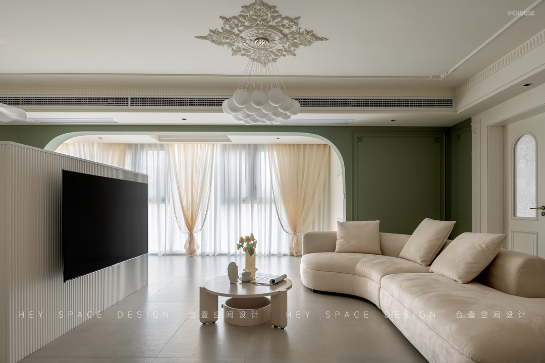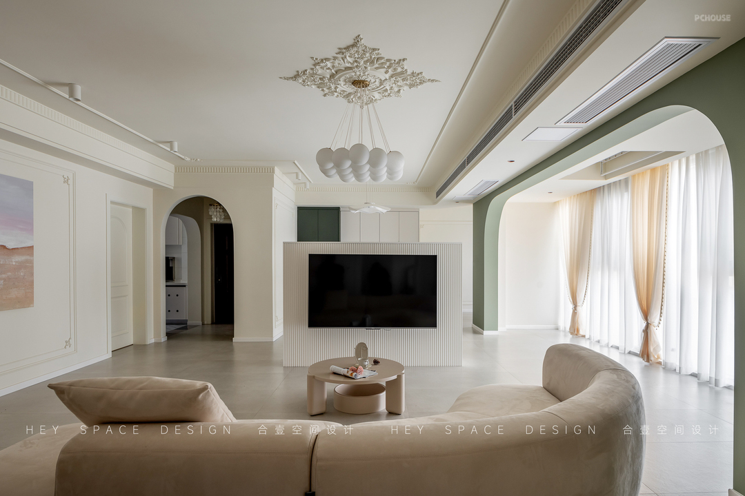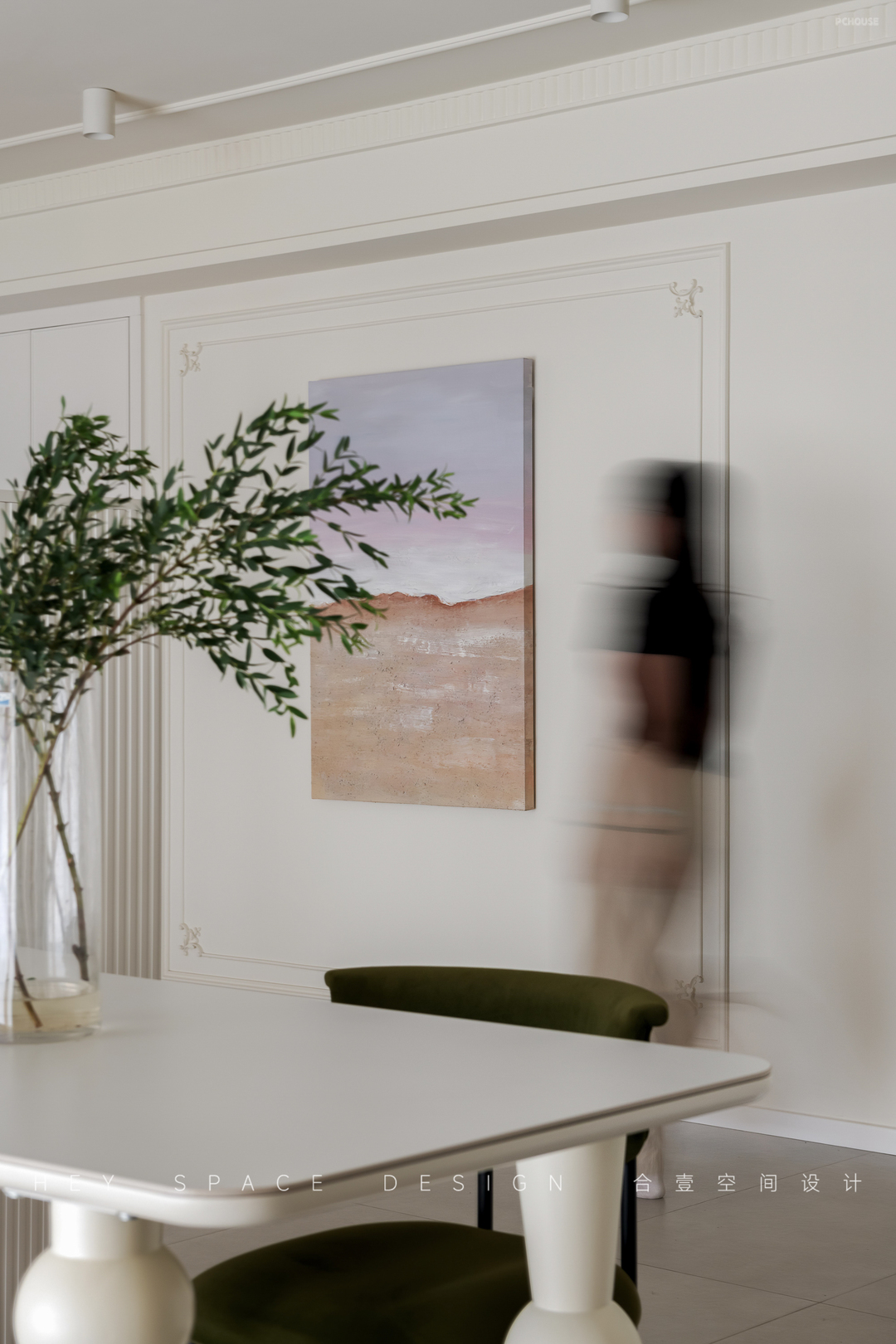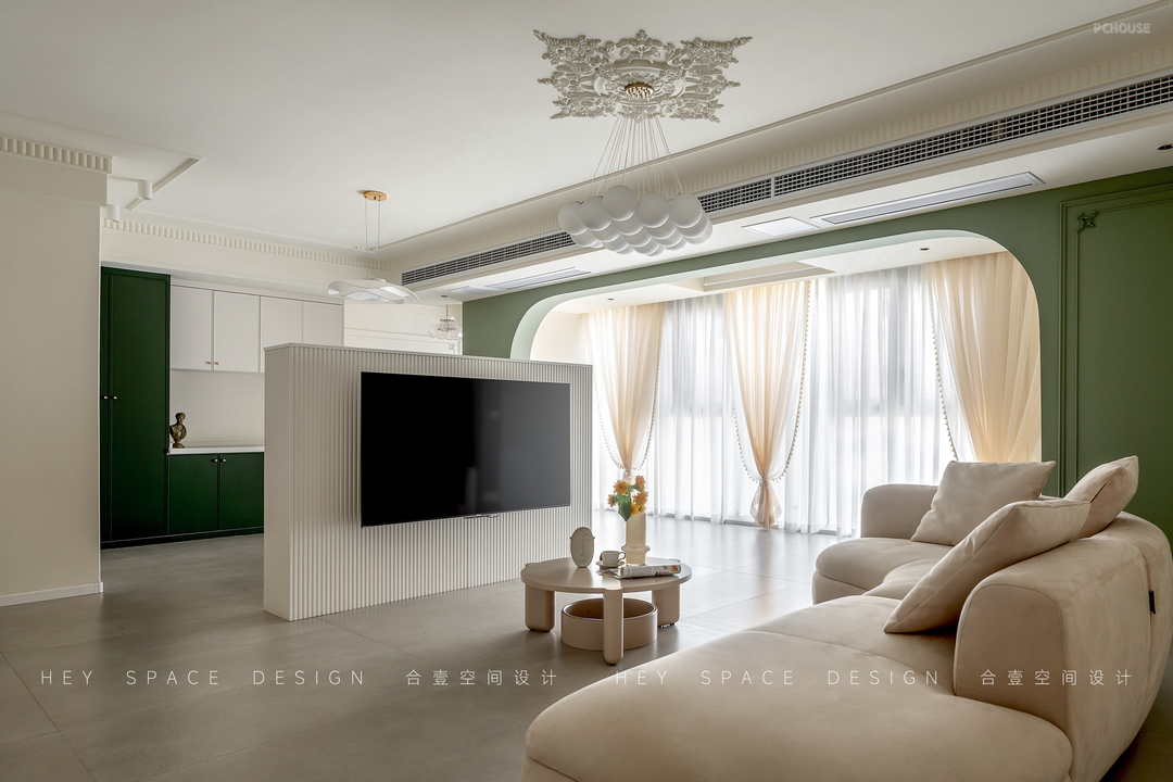 @合壹空间设计:法式的优雅温柔,奶油般的色调,线条勾勒的流畅,电视墙不同于往常的设计,半墙设计的电视墙,自然的分割客厅、餐厅区域,让空间更自由灵活。