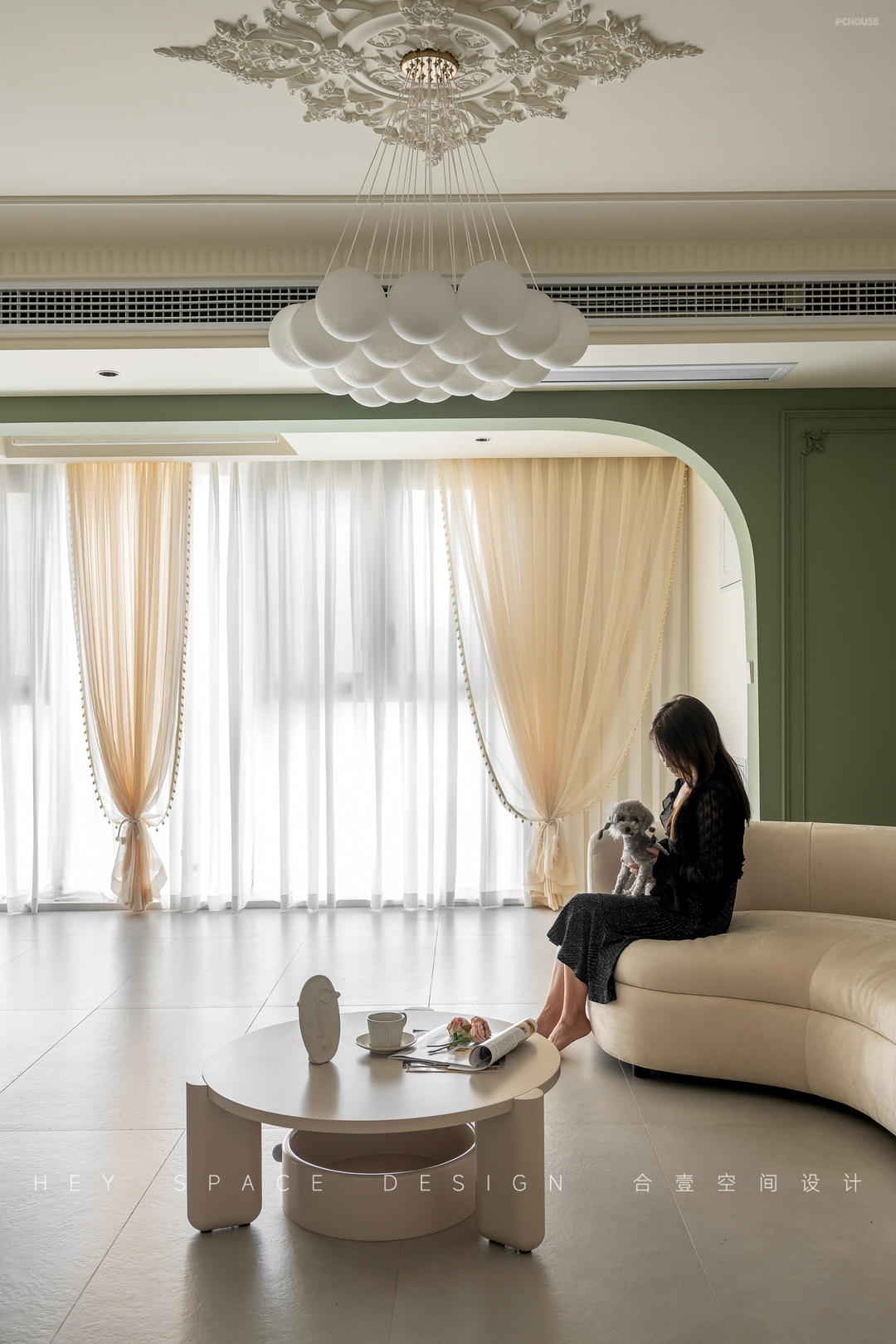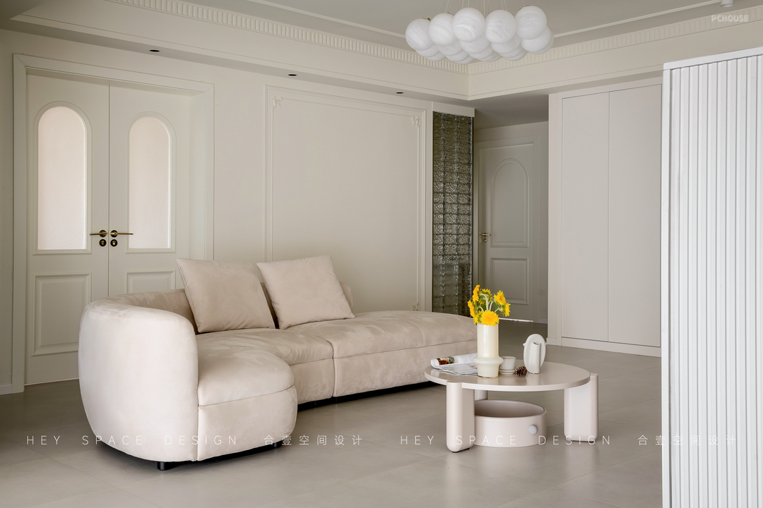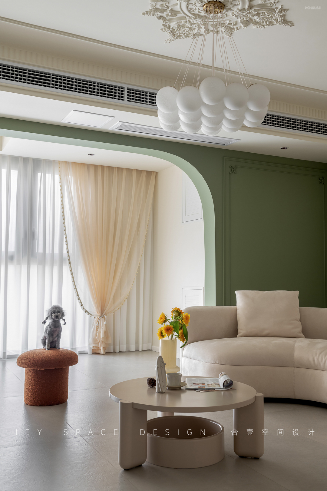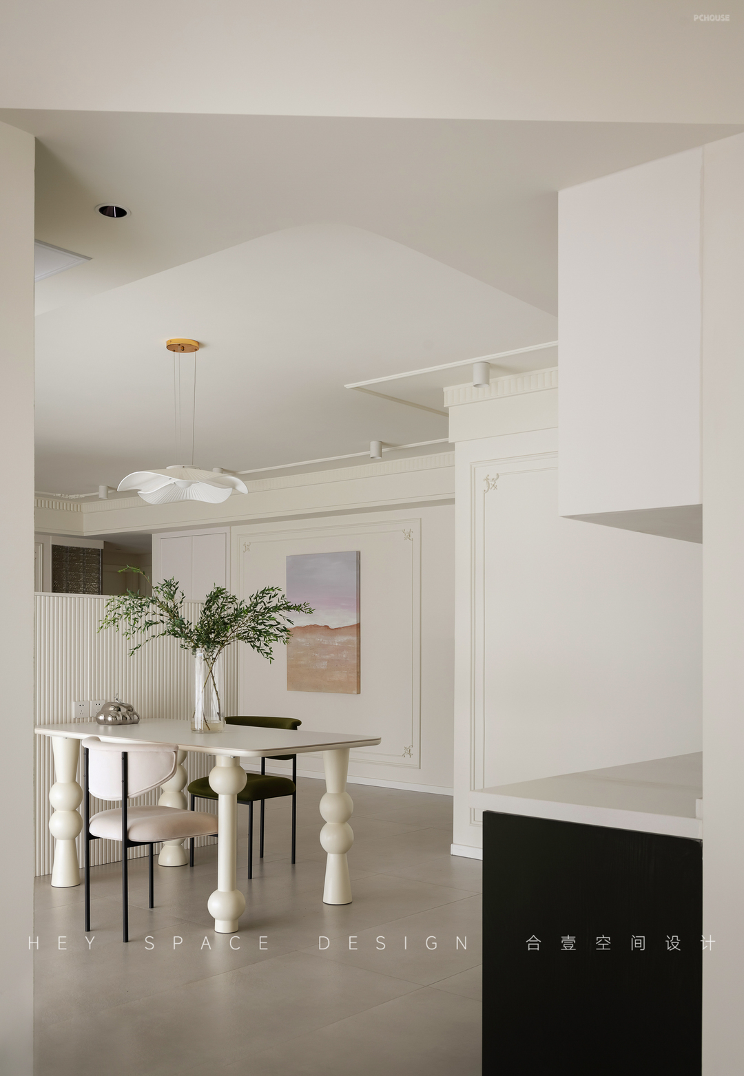@合壹空间设计:法式的优雅温柔,奶油般的色调,线条勾勒的流畅,电视墙不同于往常的设计,半墙设计的电视墙,自然的分割客厅、餐厅区域,让空间更自由灵活。