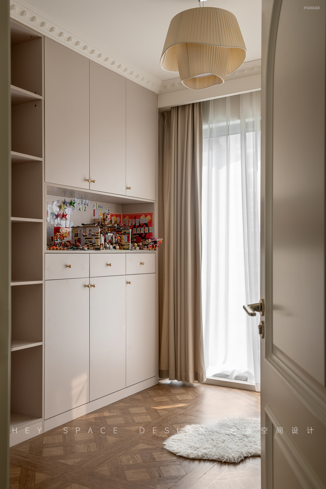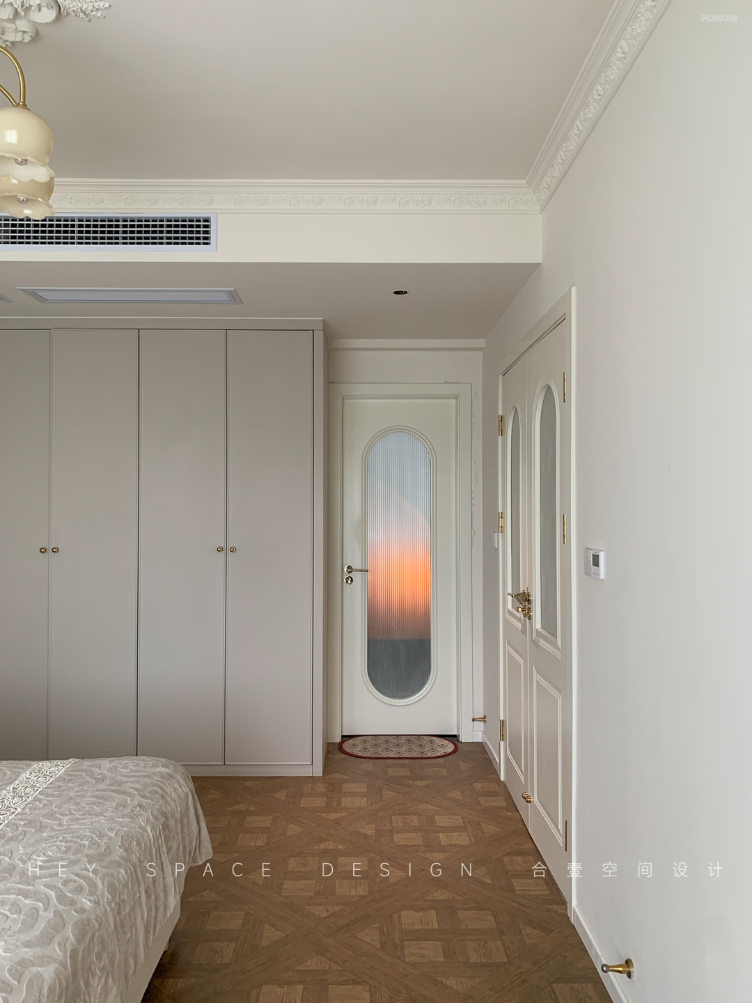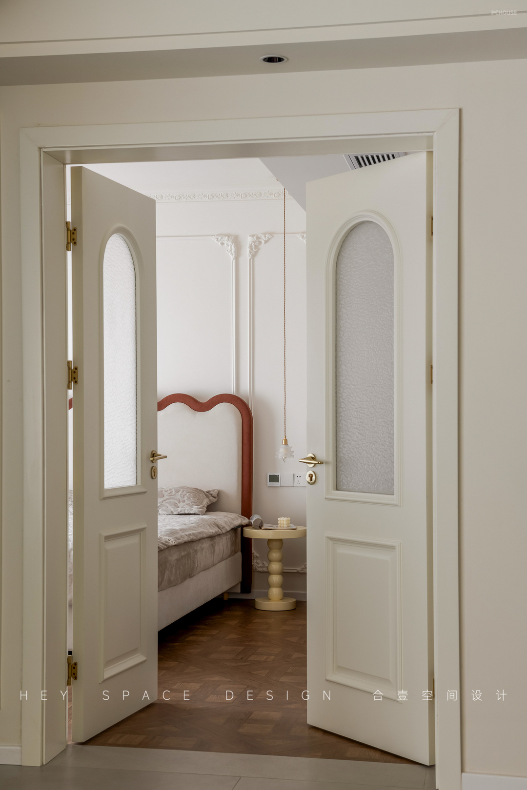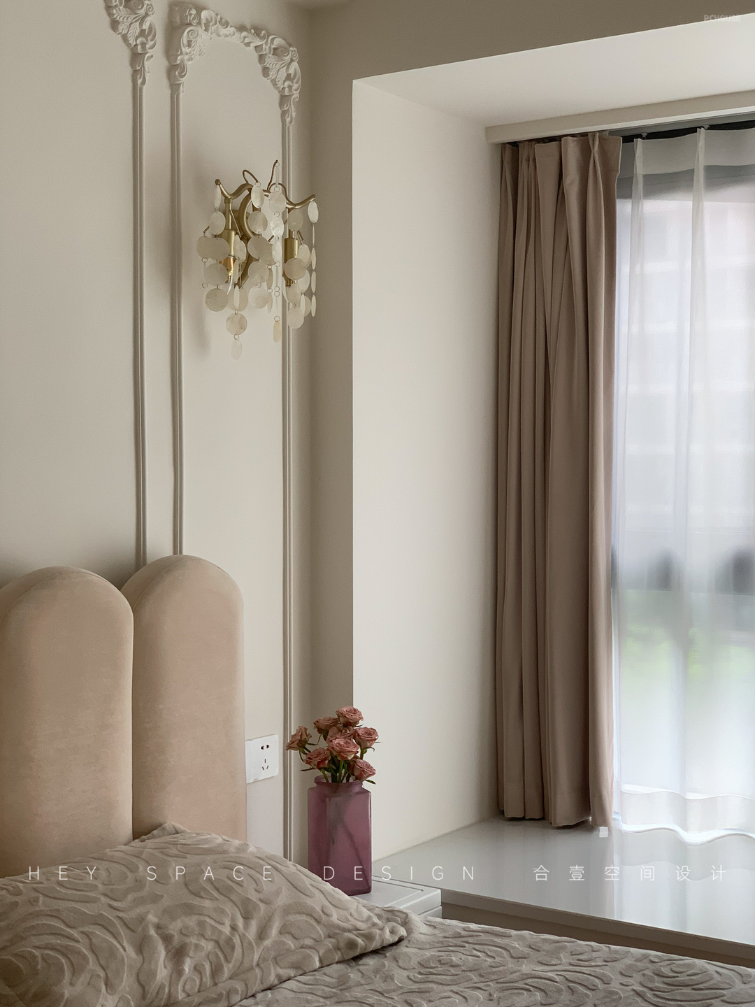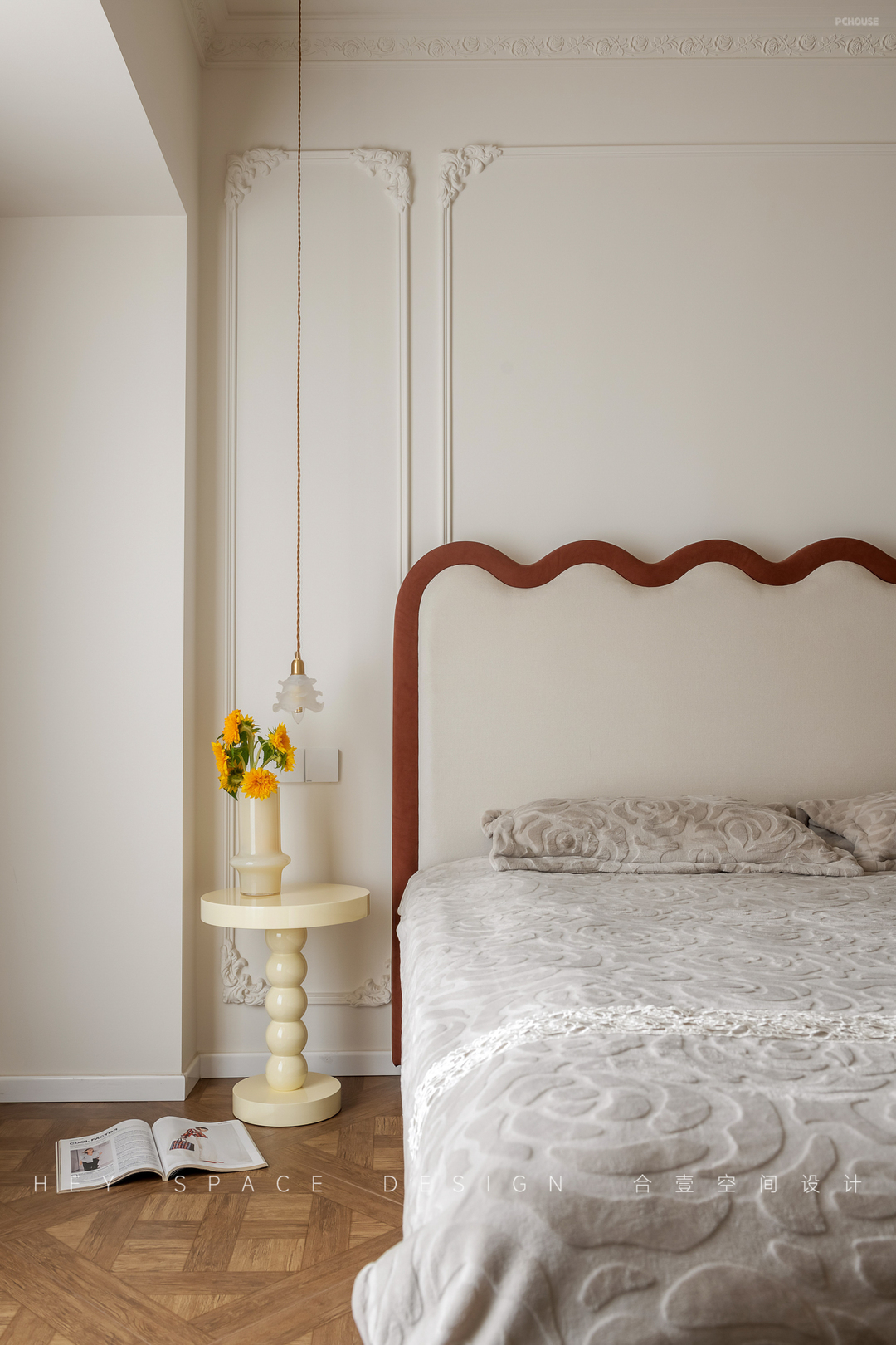 @合壹空间设计:推开主卧双开门,得以窥见美好一隅,花朵造型的吊灯,造型优美的床头,都给人不失精致的舒适感。