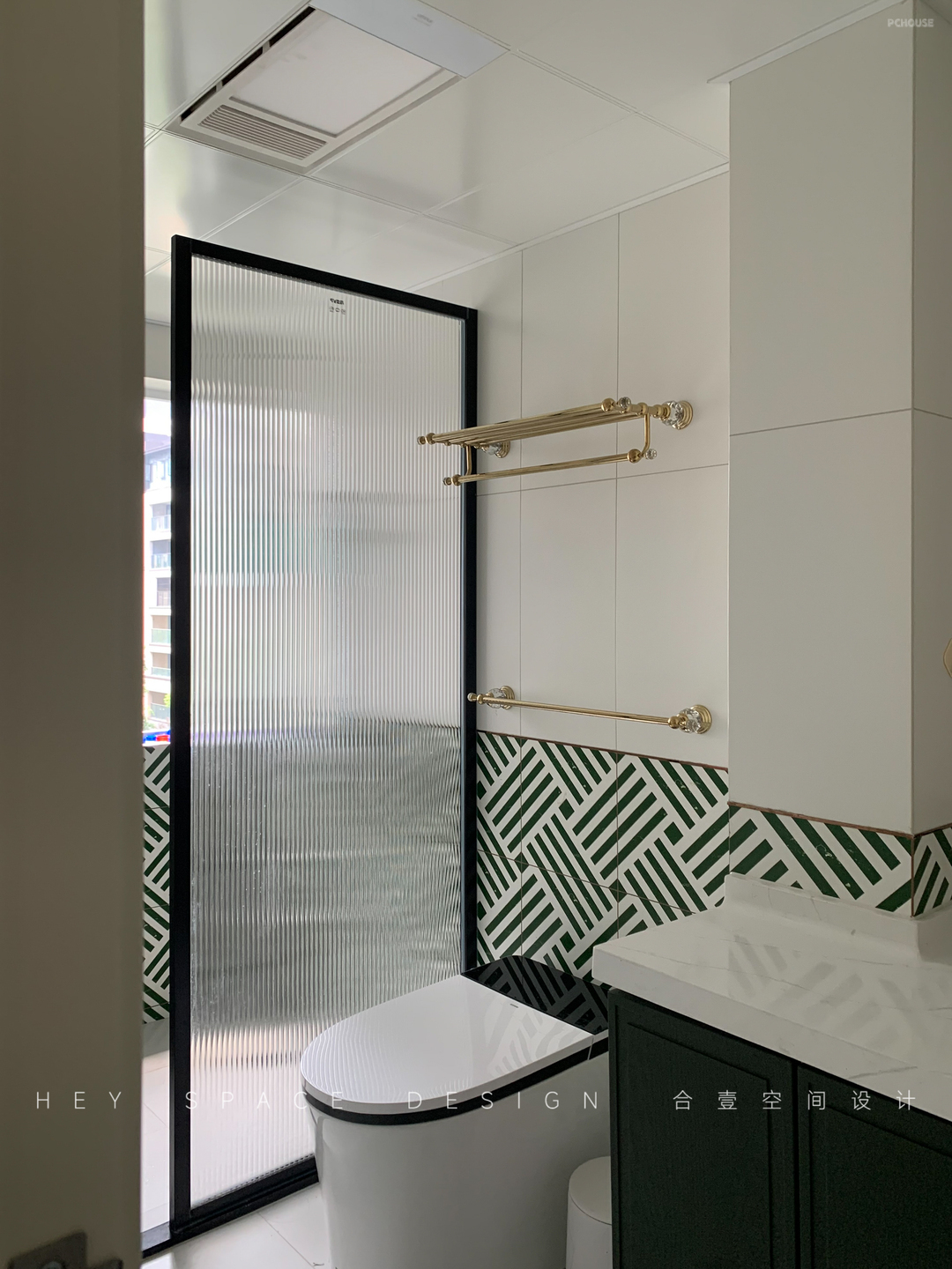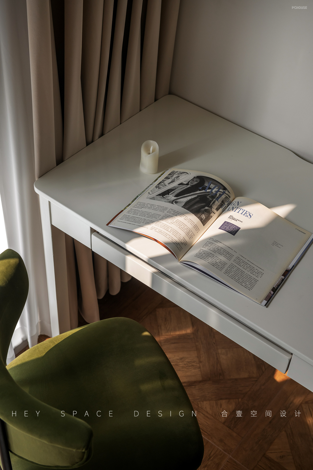 @合壹空间设计:低饱和的绿色,更能融入这温柔而静谧的空间,不会过分单调的色彩,更能带来温暖治愈感。