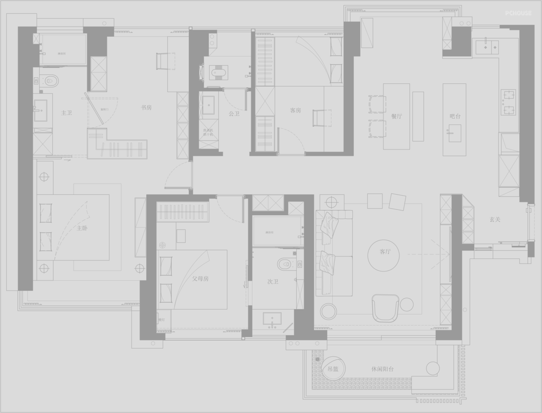 房间、书房、卫生间通过玻璃隔断串连互通,人游走其中,开放与私密兼容。