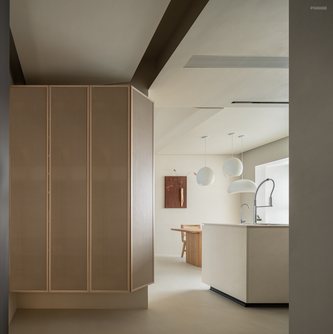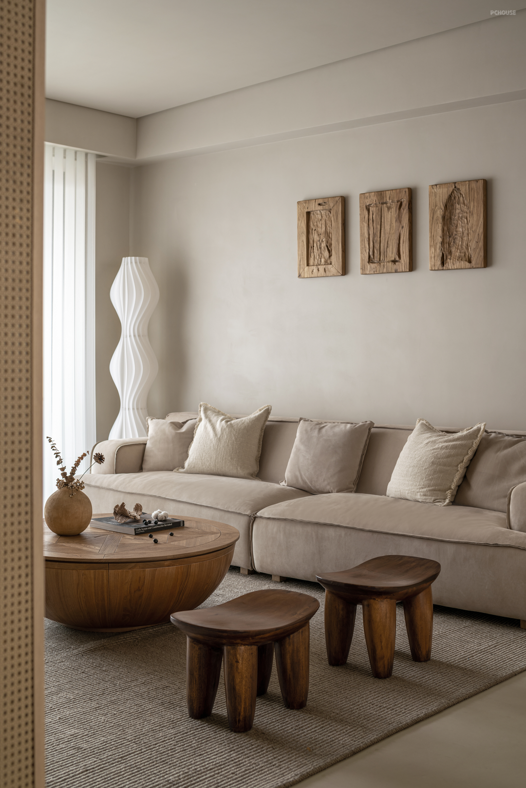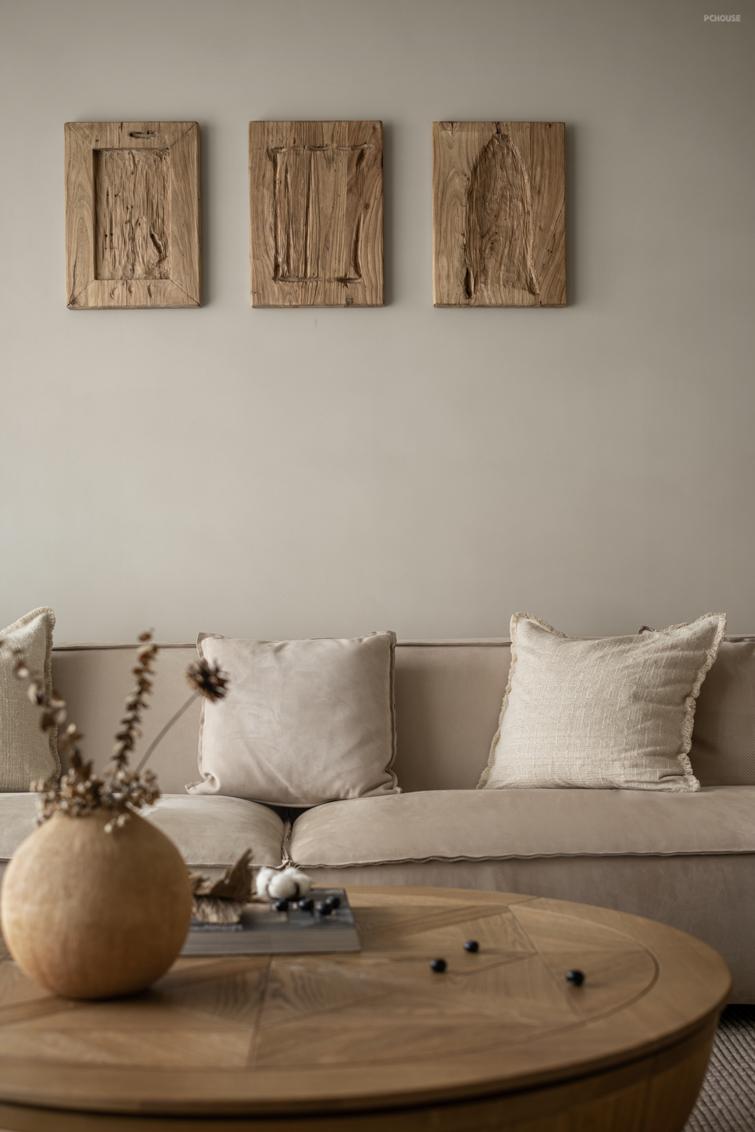 编织造型门粗犷的质感与细致的微水泥形成强烈对比,原木的家具和雕琢后的老木板装饰画,在空间中成为点缀,暗示着传统和现代,过去和当下的某种对话。