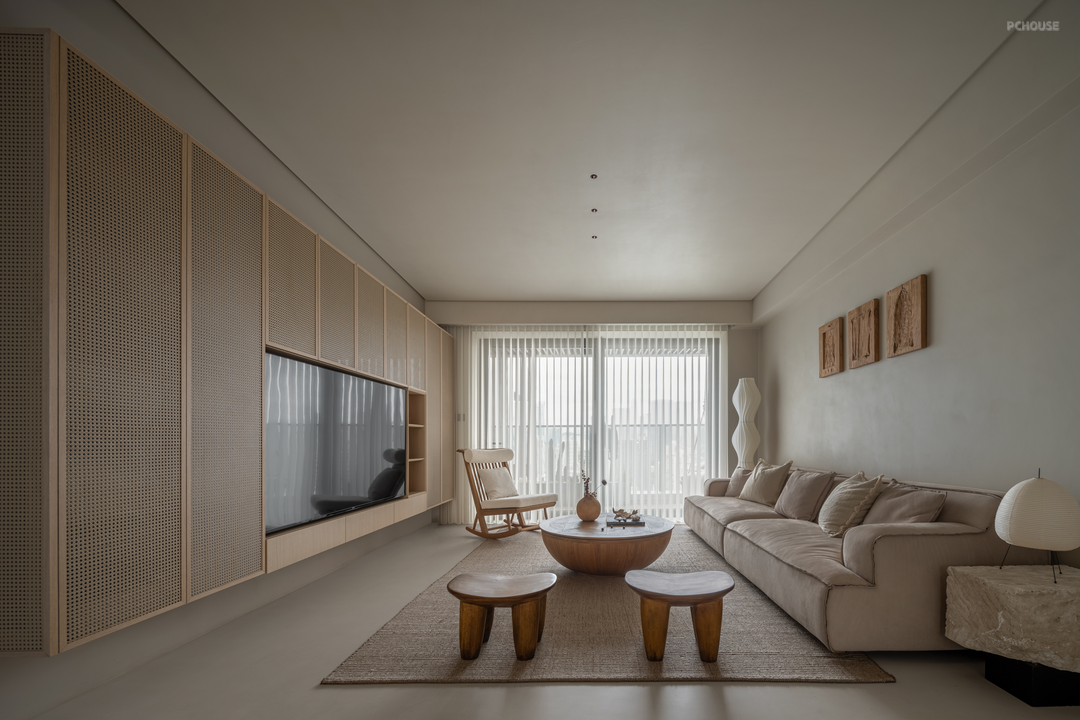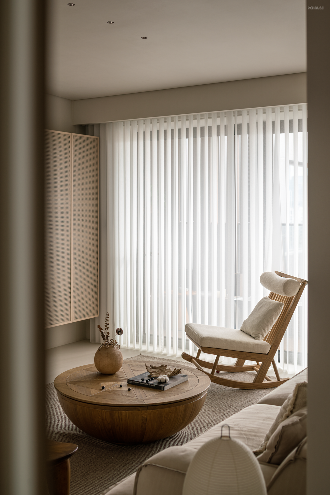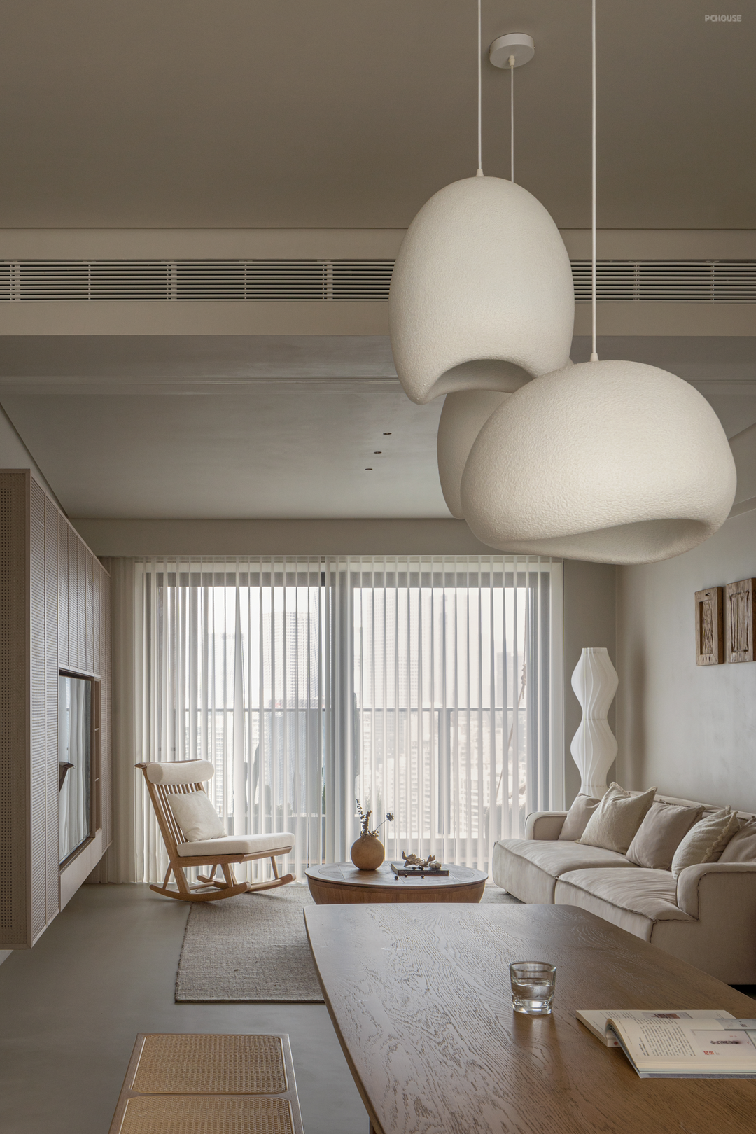编织造型门粗犷的质感与细致的微水泥形成强烈对比,原木的家具和雕琢后的老木板装饰画,在空间中成为点缀,暗示着传统和现代,过去和当下的某种对话。