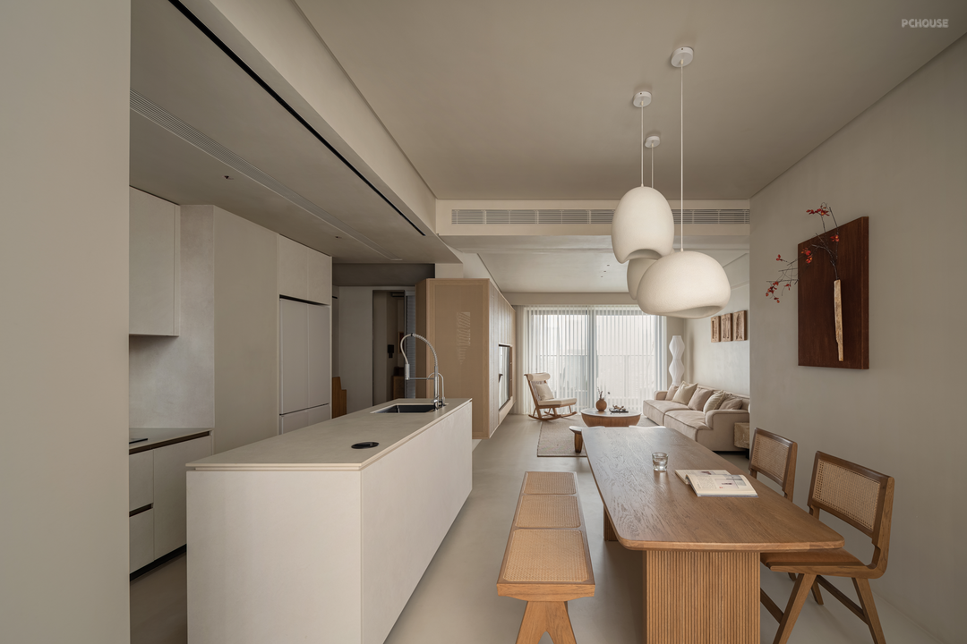 岛台台面用的水泥色岩板,跟整体空间更加协调。