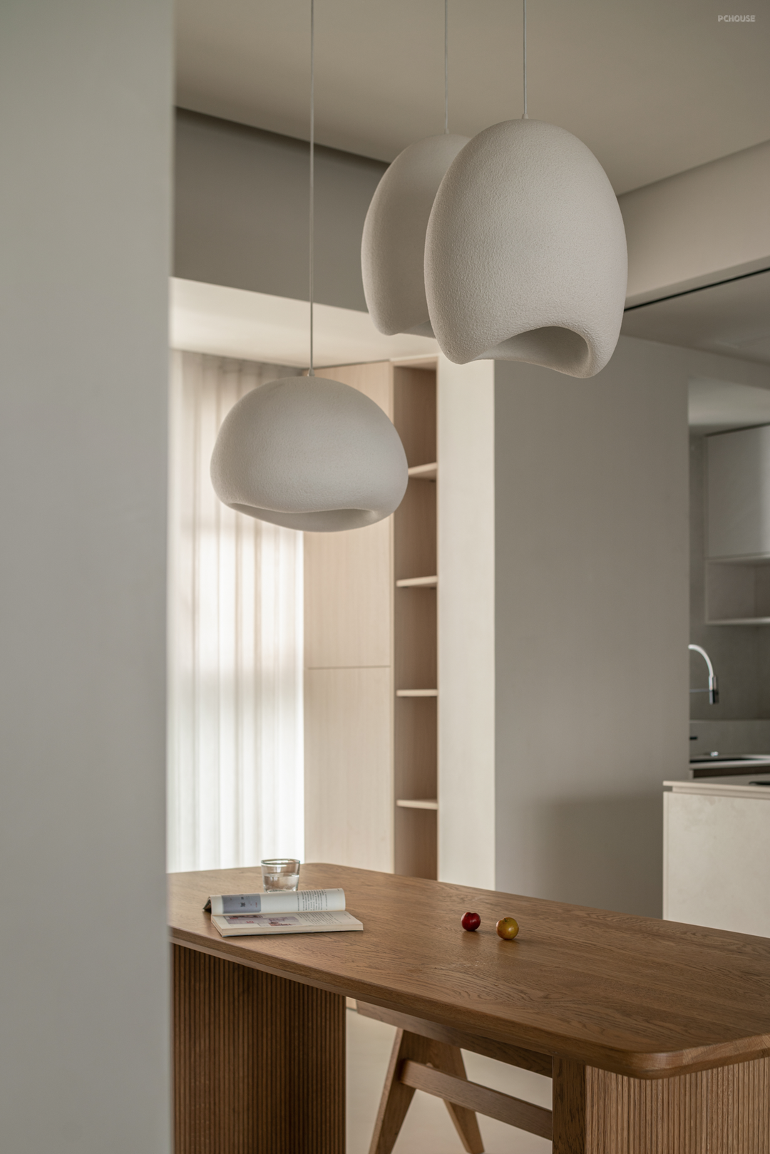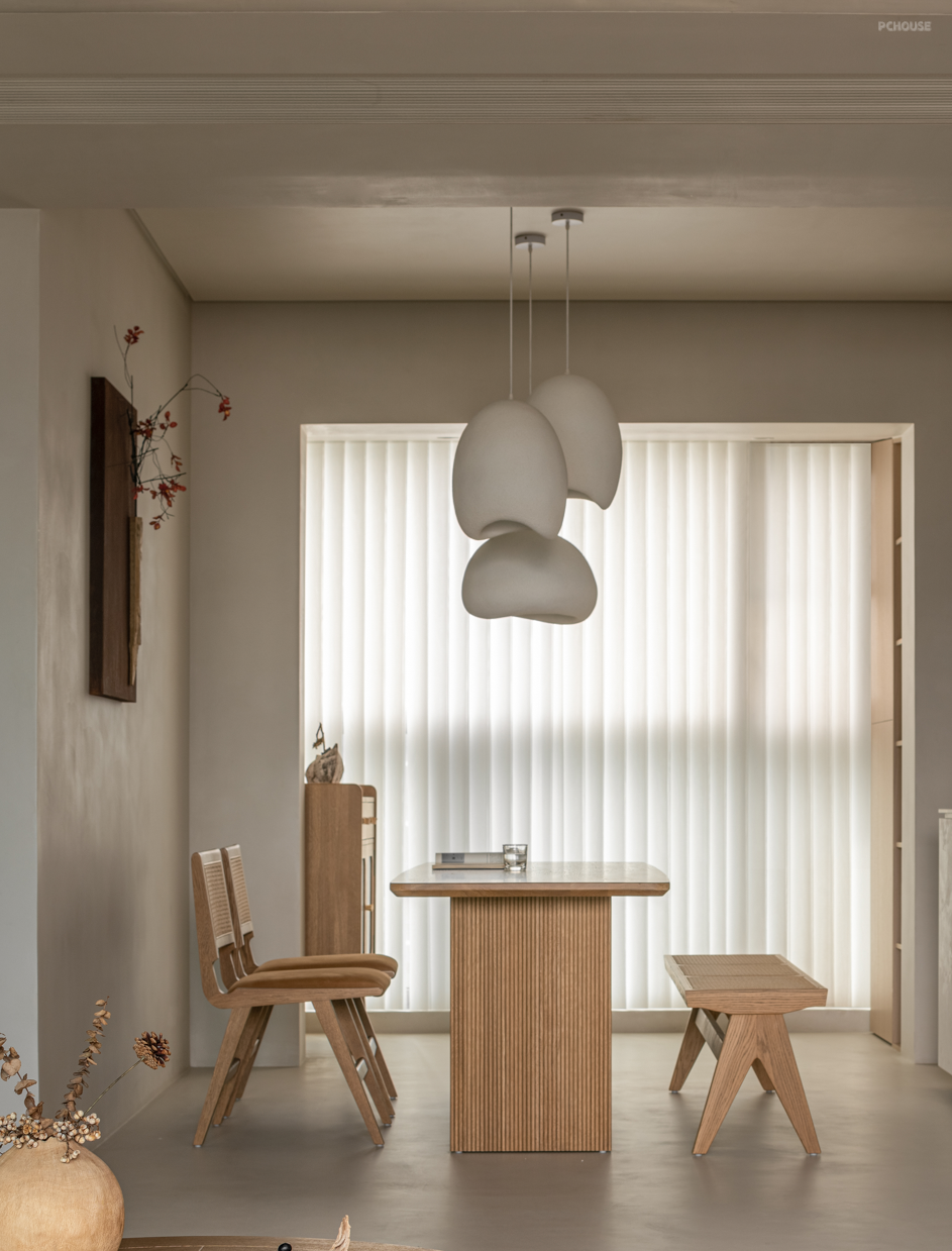 餐厅的材质选择以原木为基调,结合藤编,异形椭圆的装饰吊灯营造轻松休闲的餐厅氛围。