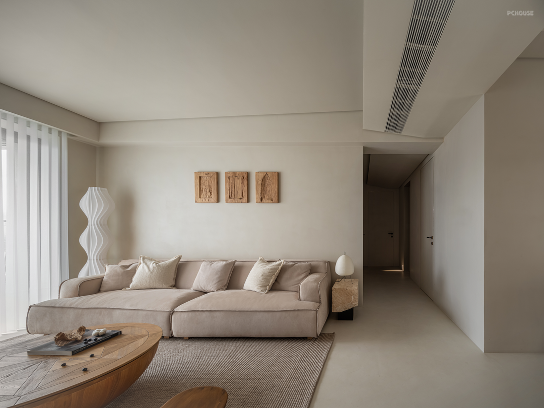 为了减少空间的压抑感,设计上用体块的方式表达空间和功能的关系,天花倾斜的造型和墙面呼应,鞋柜用悬浮的形式从玄关延伸到客厅,让空间形式更加具有雕塑感。材质和形式统一,同时还起到空间的引导作用。