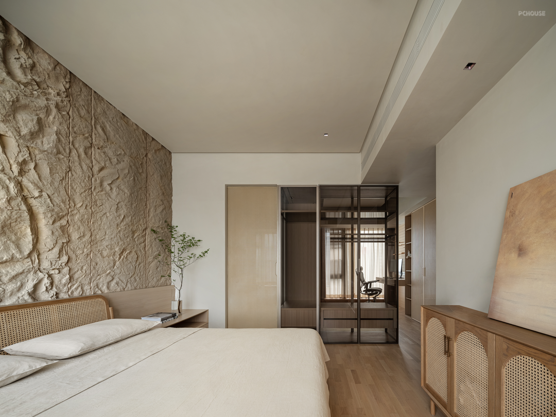 粗犷的山岩石材质背景,在空间中特有的存在。朴实的材料,创造出安静、平和的居室氛围。