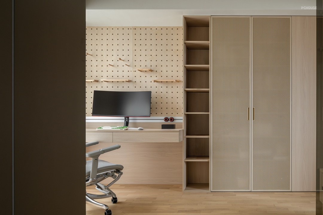 开放式书房,墙面的洞洞板方便置物,悬空写字台让空间更加开阔。