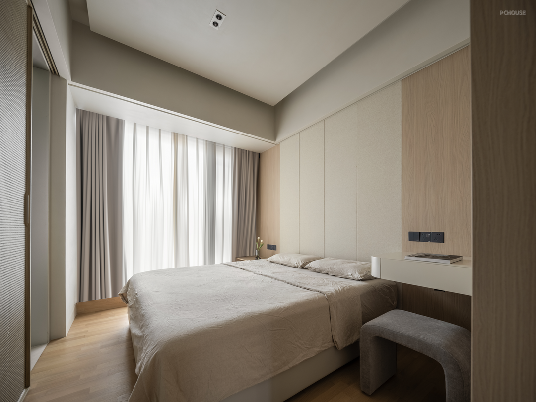 “实用方面的问题是最首要的,美学问题只是在后面的阶段才会出现,情感因素也是重要的,一个房子应该反映主人的生活方式和个性——维伍德”。而这正是我们希望去传递的,空间处理上,用体块的方式去处理天花和结构设备的关系,灯光去强化体块,不同斜面穿插,增加空间纵深感。微水泥材质贯穿所有空间,用简单、纯粹的设计美学去塑造空间。软装家具用原木、棉麻面料、编织结合,根植于过去、连接到未来、融入当今舒适的室内氛围的创造。