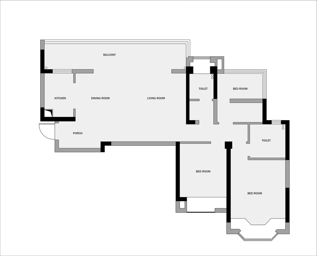 ①原始户型中景观阳台拉通整个客厅,无生活阳台,不便于日常洗衣晾晒,阳台与客厅之间的墙体有碍视线,影响空间通透性。