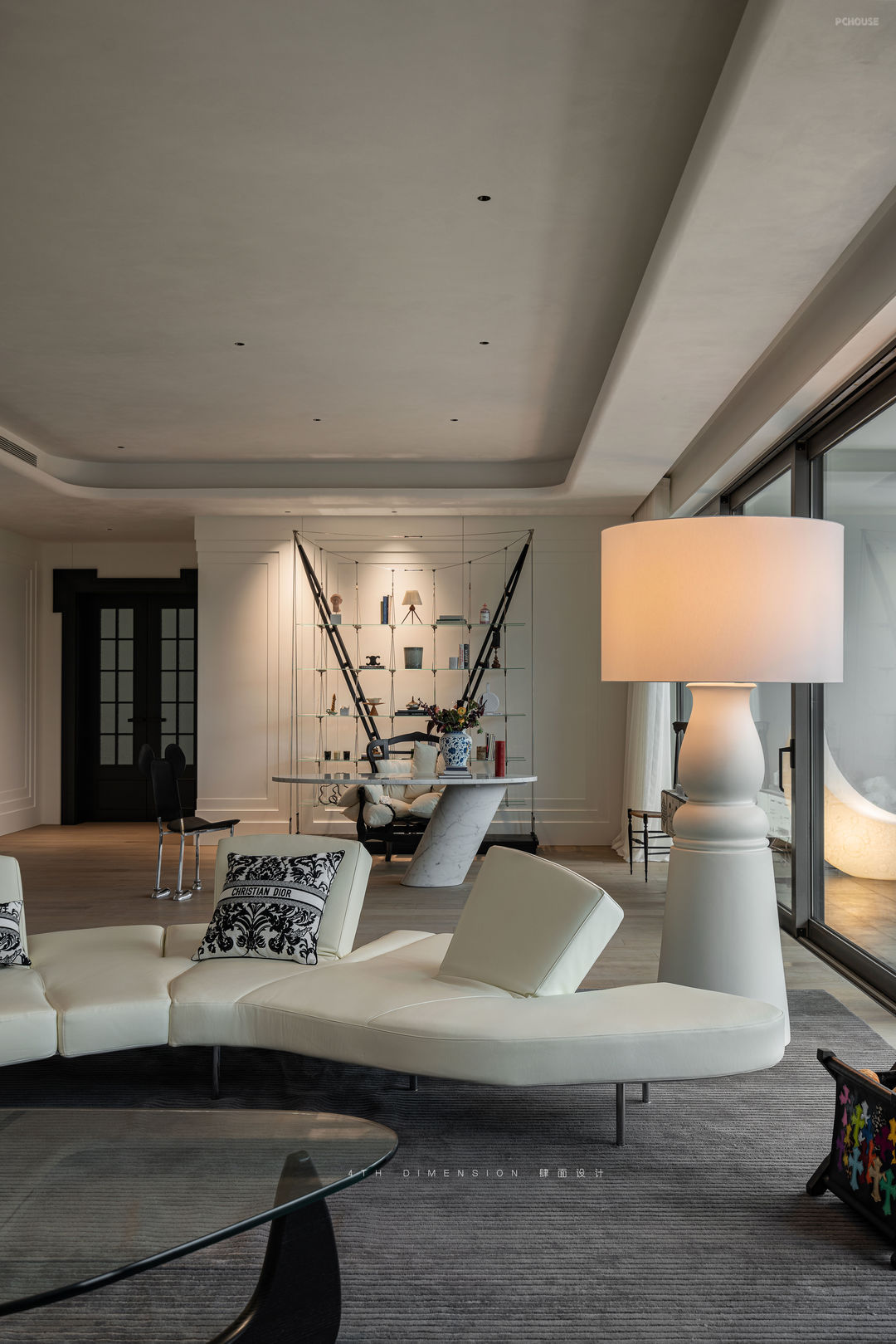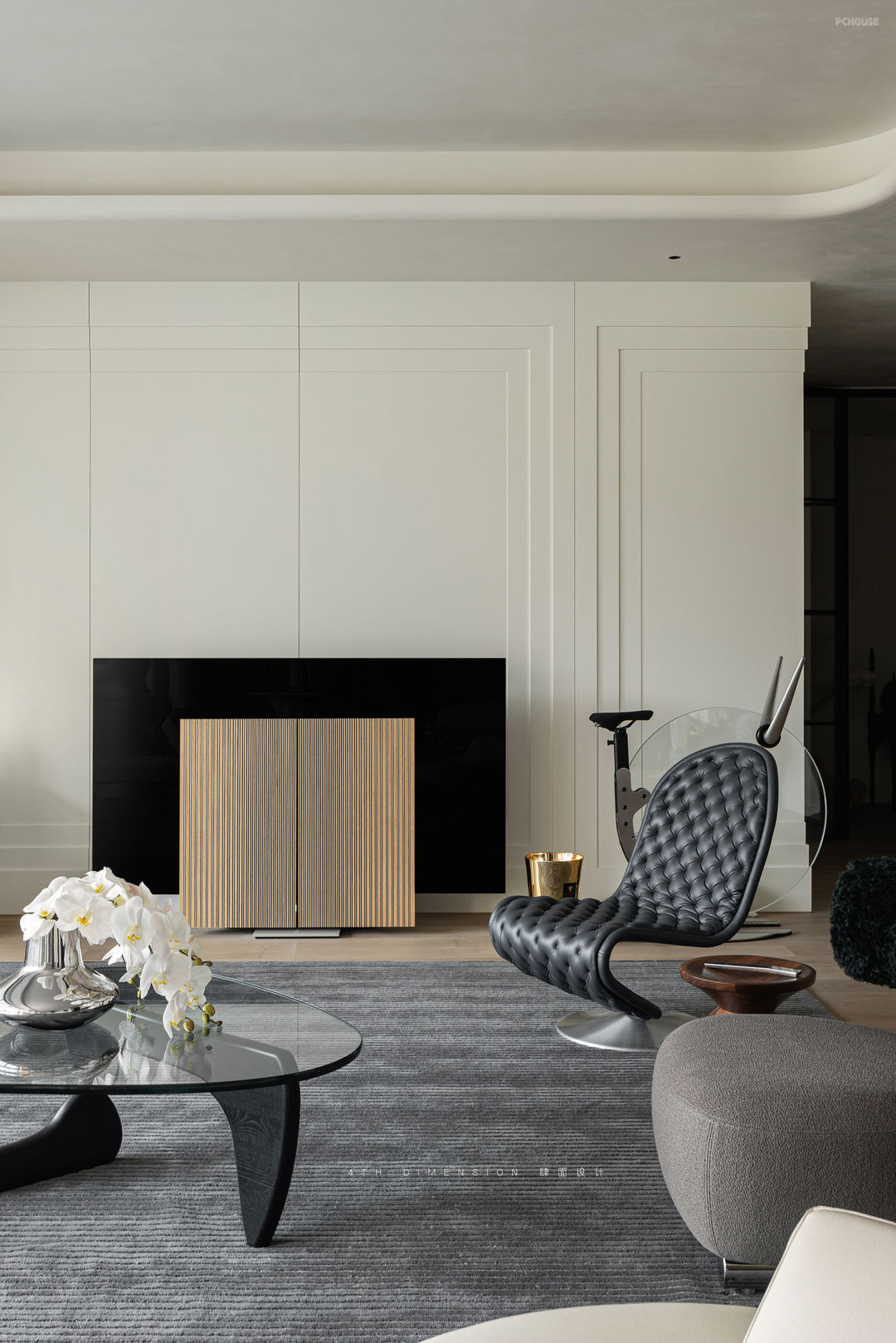 原始的墙面造型被拆除,取而代之的是干净的白色线条。顶面,我们用艺术漆加深空间层次。在这样干净的底色之下,才能将更多经典的、值得被收藏的、艺术的、不同时代的中古家具一一收藏。