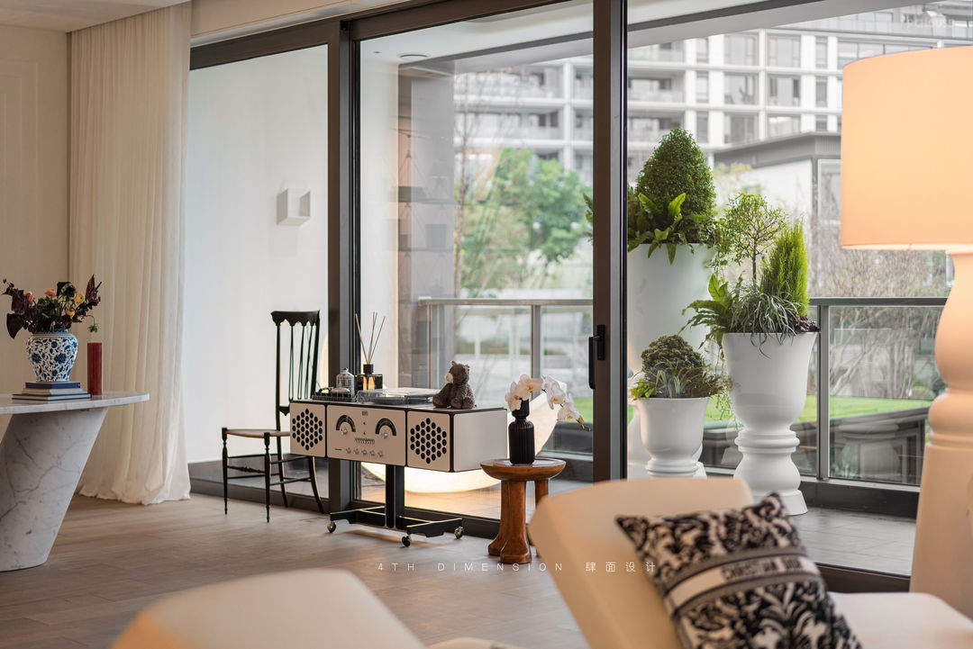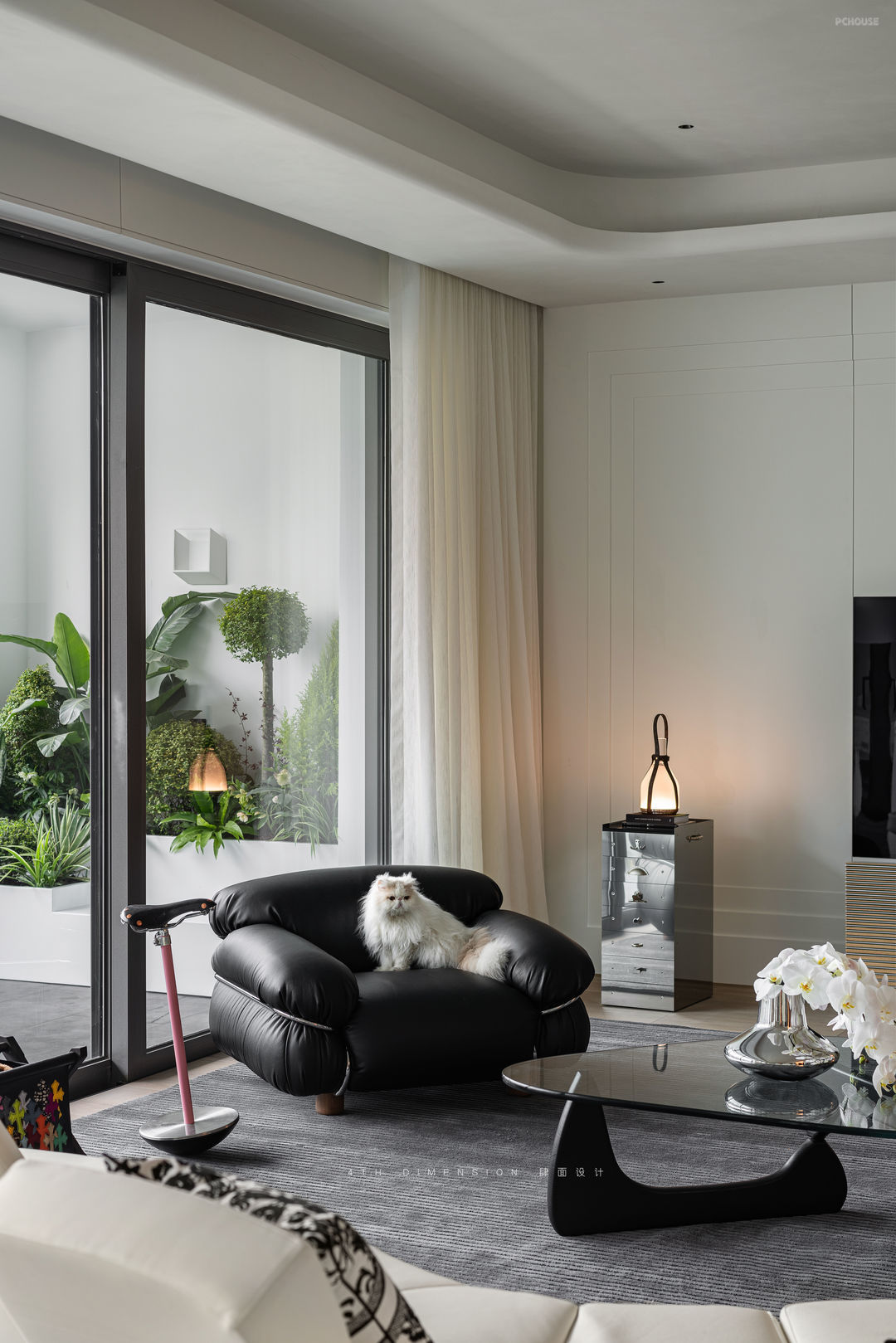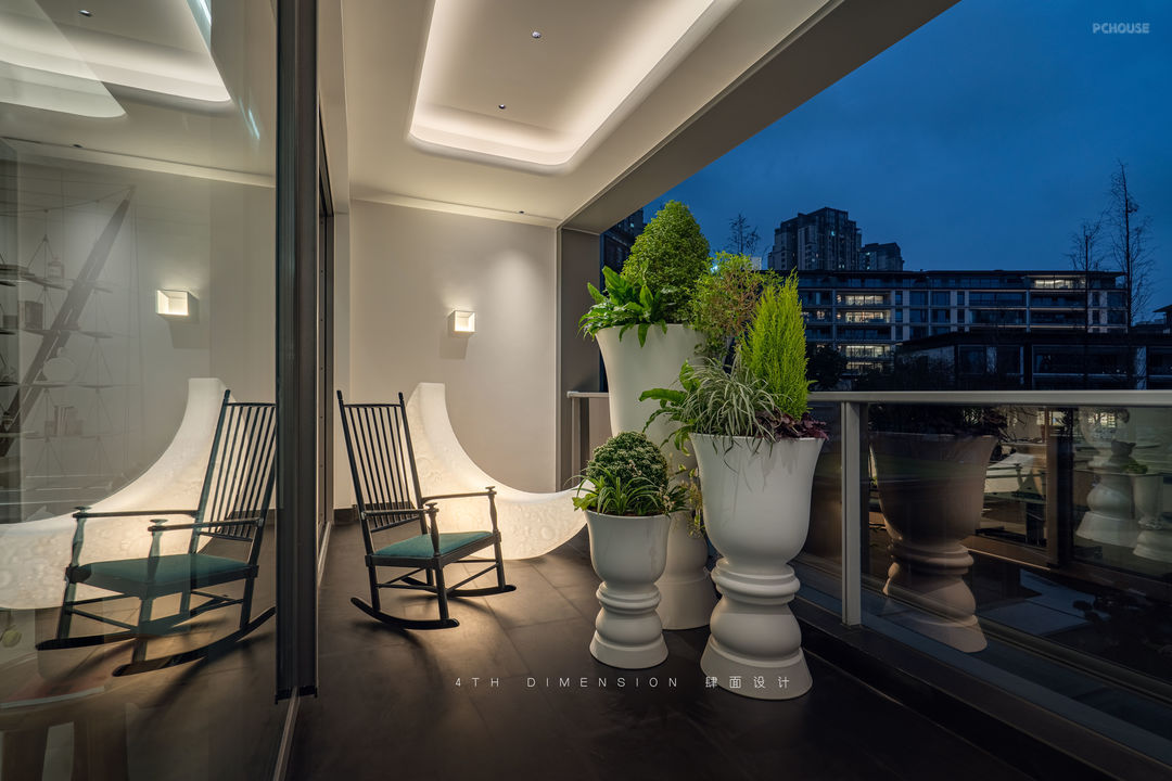 阳台两端种满了绿植,这里不只黑白,更能触摸自然。将一轮明月化作月弯装置,搬回自己家中,与耿耿星河相辉映。
