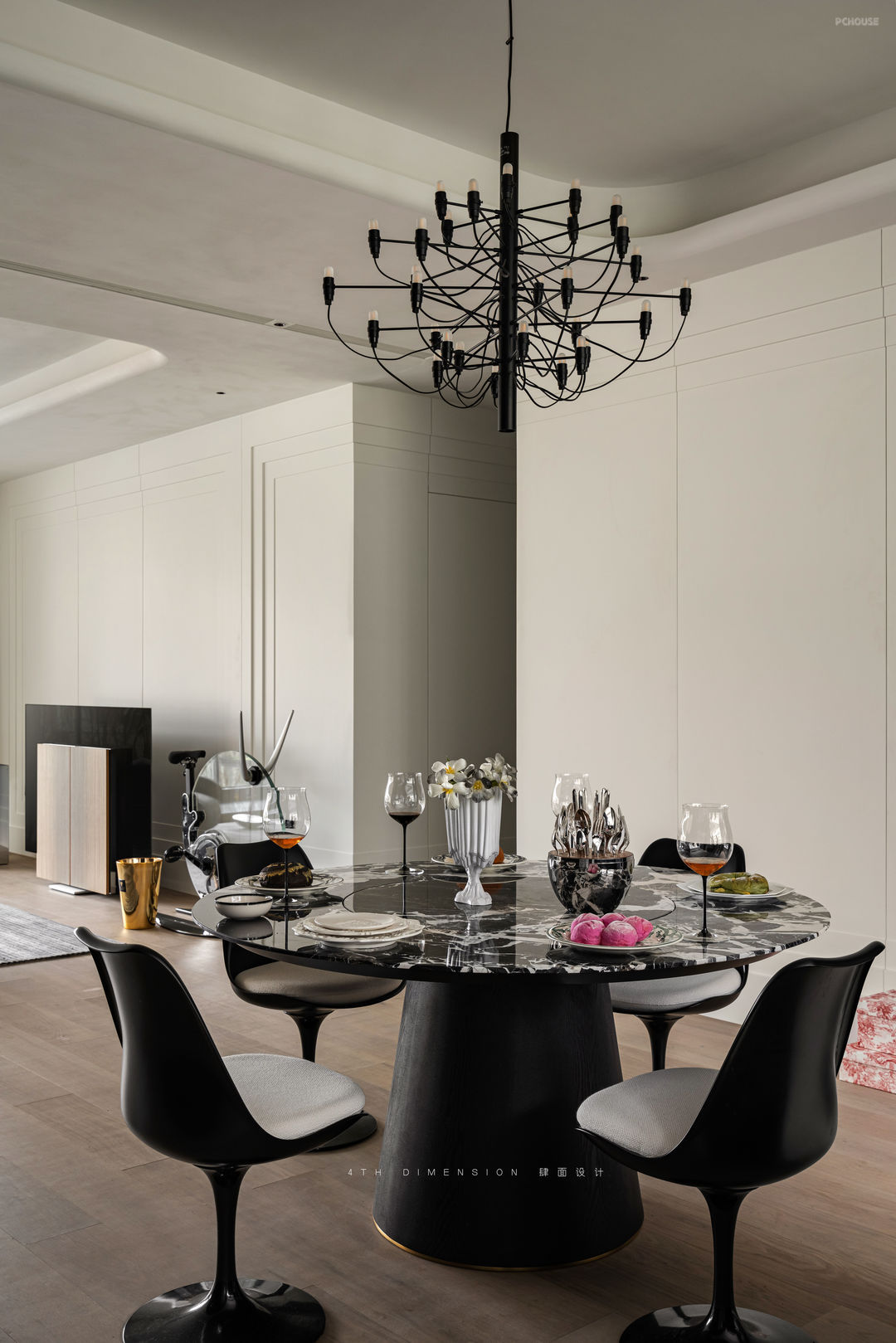 如果说白是客厅的底色,那开放式的餐厨区被黑色填满。黑色之中,宝格丽奢石点缀了空间材质,Flos的果实吊灯就像黑夜里绽放的花朵,在立面的肌理中可以清晰看出设计团队对黑白色调的优雅致敬。