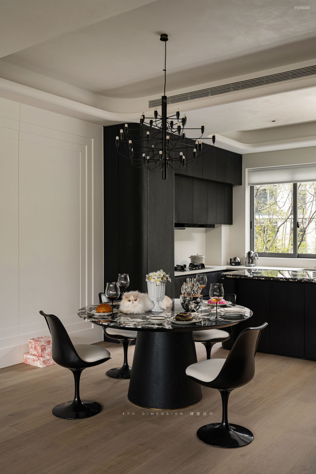 If white is the background color of the living room, then the open kitchen area is filled with black. In the black, there are also luxury stones as spatial embellishments, and in the texture construction, it is clear that the design team pays tribute to the elegance of black and white.