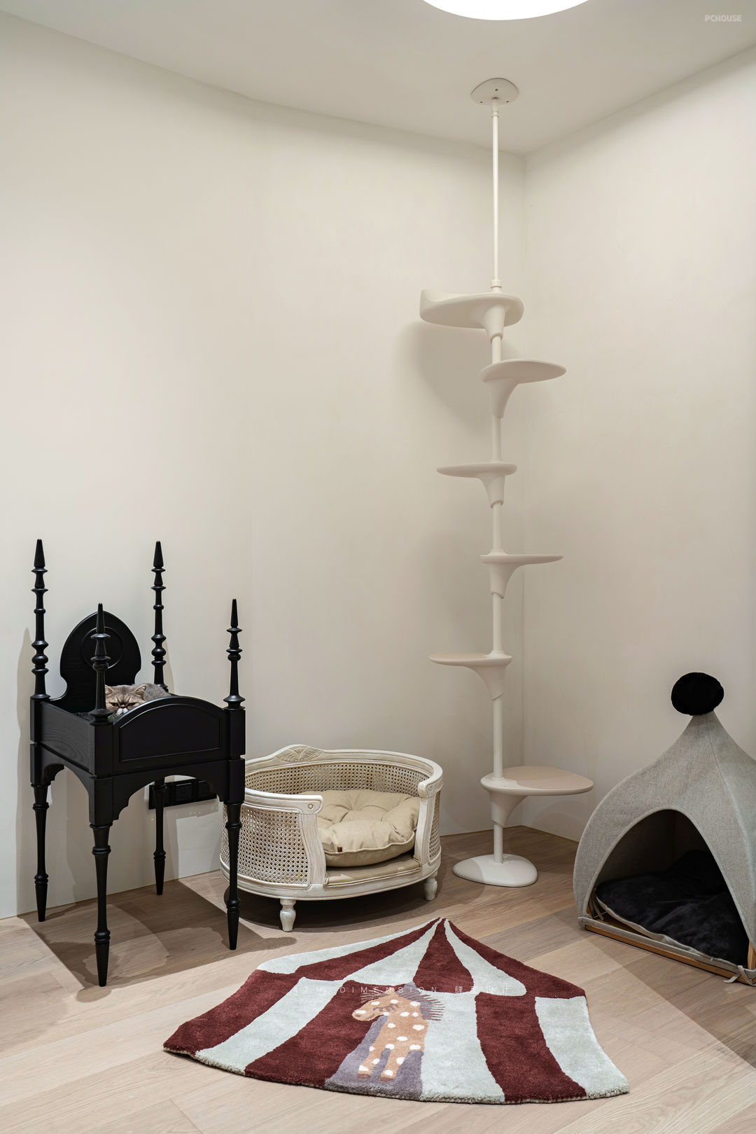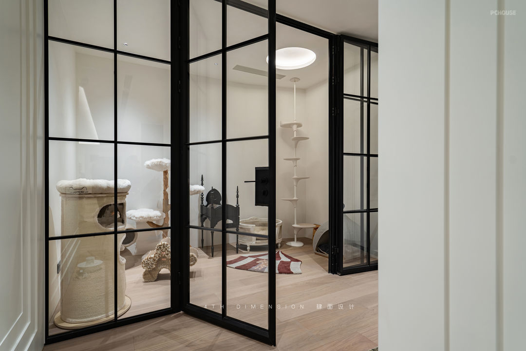 原本储物间改造为三只宠物的玩耍室,复古的格框门作为隔断给予了空间更多自然光照,这是我们给特殊的家庭成员最好的宠爱。