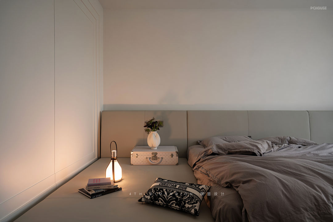 推开公区那一扇具有仪式感的双开门,主卧是与客厅截然相反的安静氛围。无论从色调、材质,休憩区给予的是最浓厚的安全感,简单且纯粹。