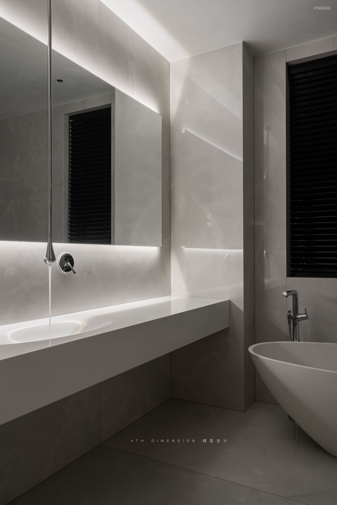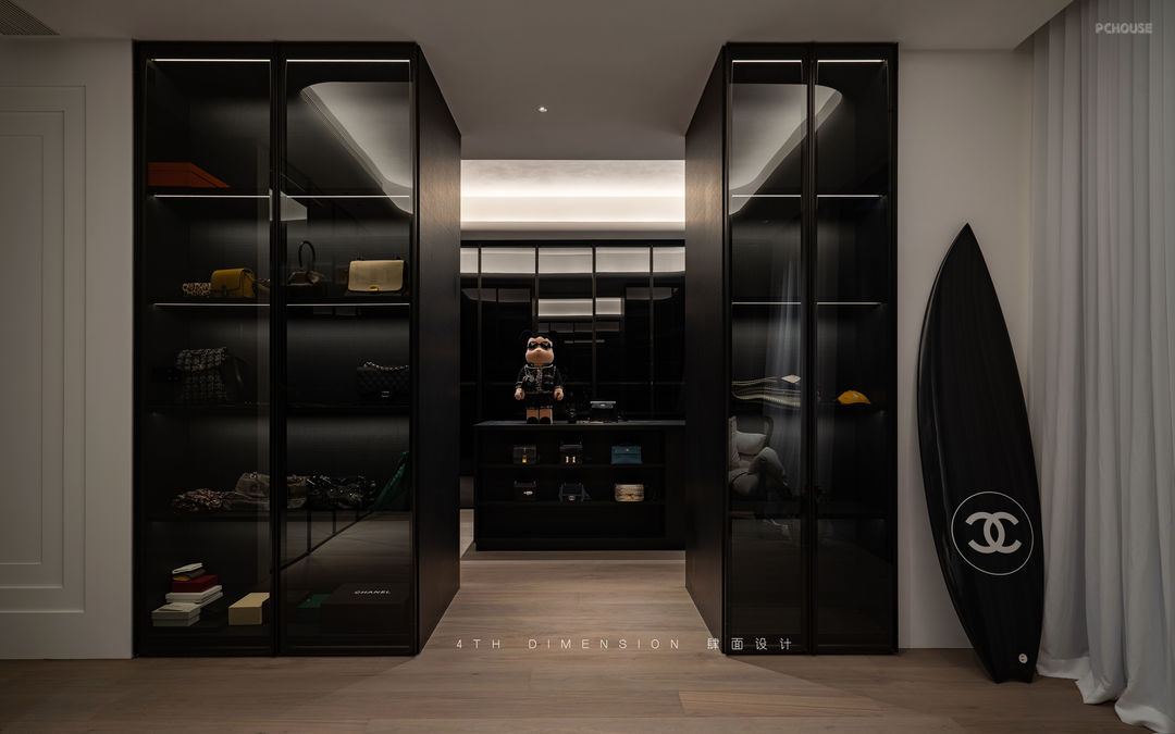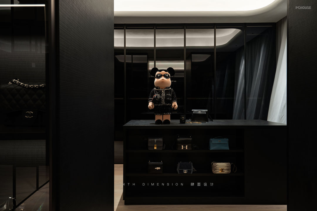 Compared to the clean color scheme in the rest area, the cloakroom has once again been used in black, giving the master bedroom suite a sense of black and white once again. The black wood grain and mirror faced cabinet door exudes a strong Upper East District vibe.