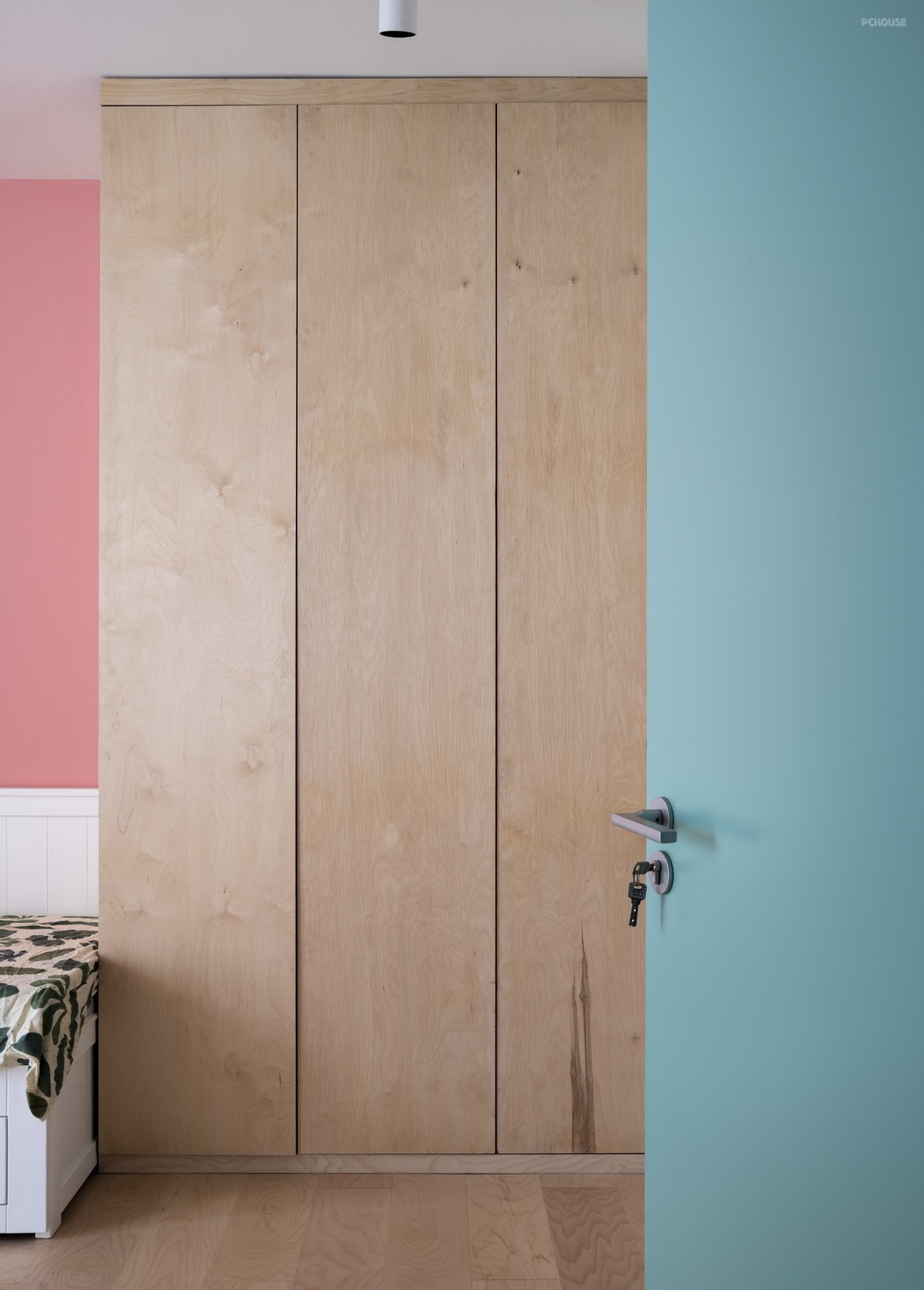 通过一个异形的门板,连接两侧厚度不同的柜子,让这个入口似有似无。内侧的空间是另外的颜色,那是另一个世界。