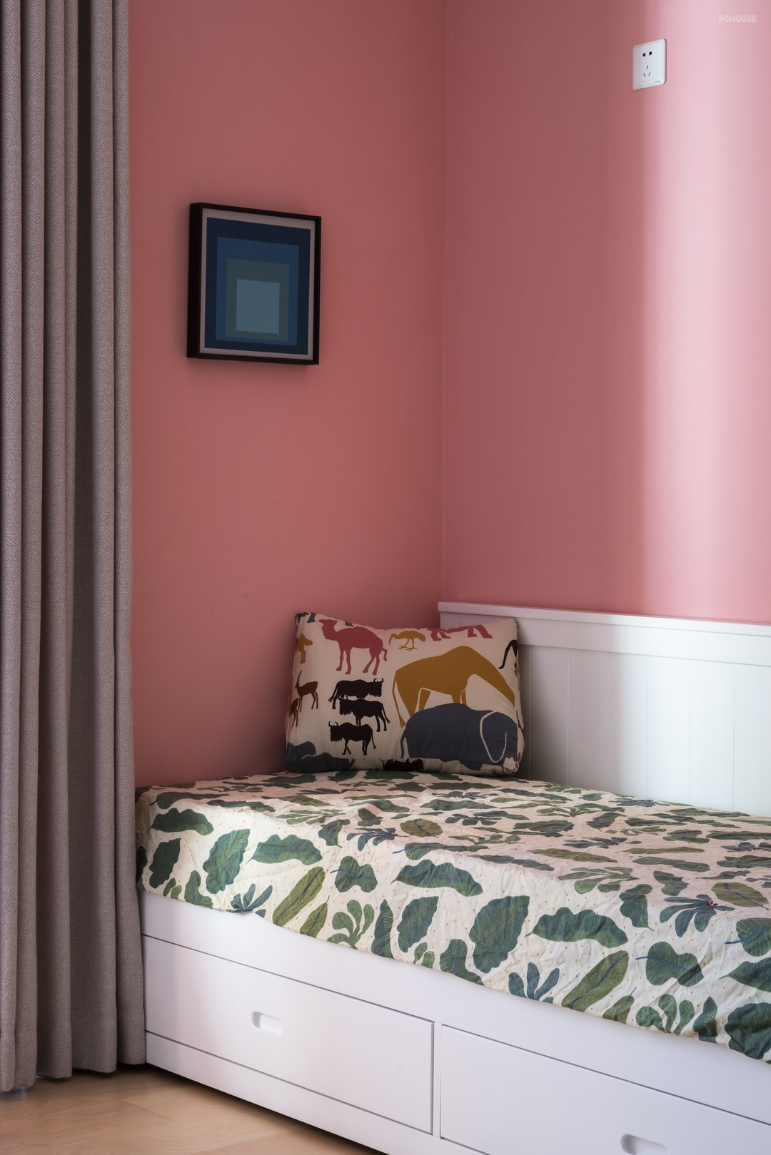 主卧的空间一分为二,用帘子分隔,一侧是居室,一侧是储物空间。帘子柔软的质感弱化了空间的界限,黄色的墙面给卧室带来了天然的新鲜感。