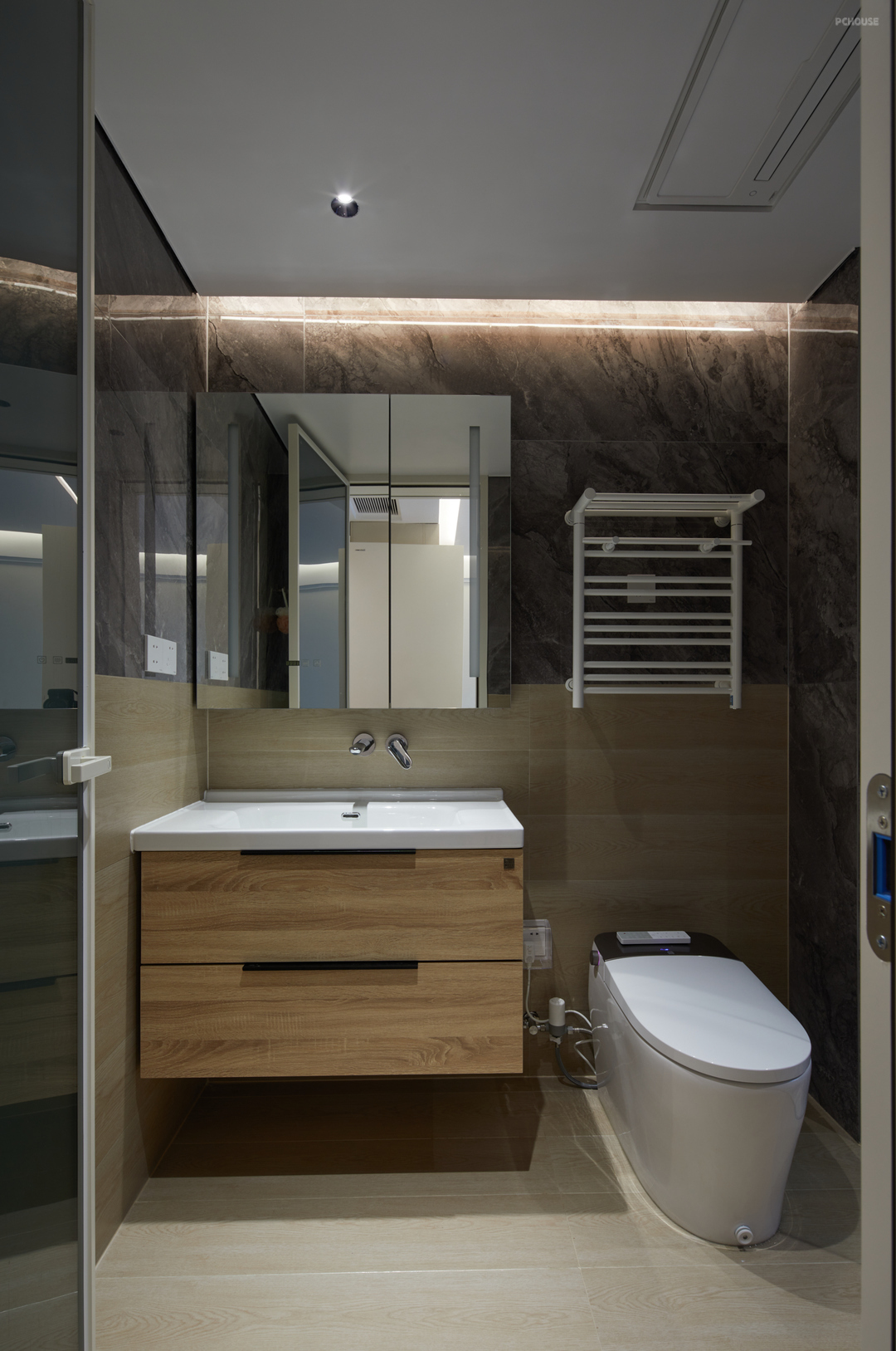 这个卫生间的墙砖采用深灰色大理石,淋浴房地砖则是浅灰色大理石。互相搭配,一深一浅,凸显整体感。既满足了男主人对主卫干湿分离的要求,还做到实用性和空间感。