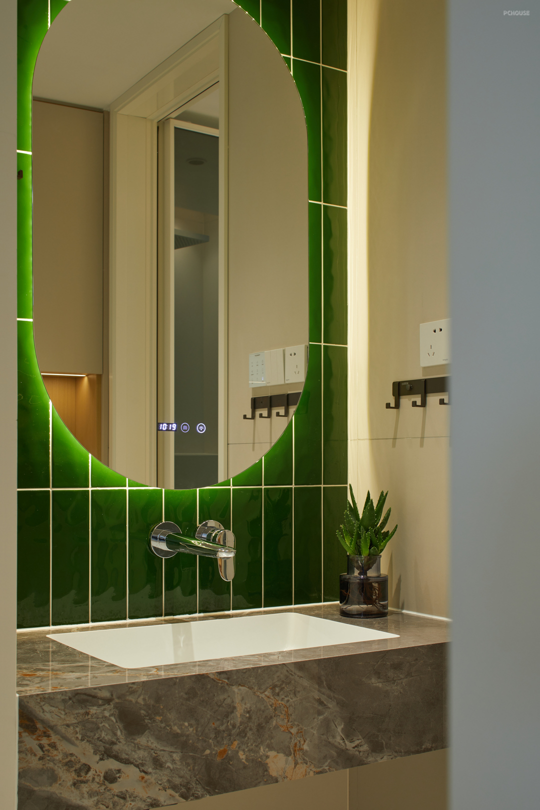 次卫洗手台采用墨绿色格子墙砖搭配大理石洗手台,亮面靓丽多彩,上墙效果不要太惊艳了,清新舒适、又有点轻复古意味~