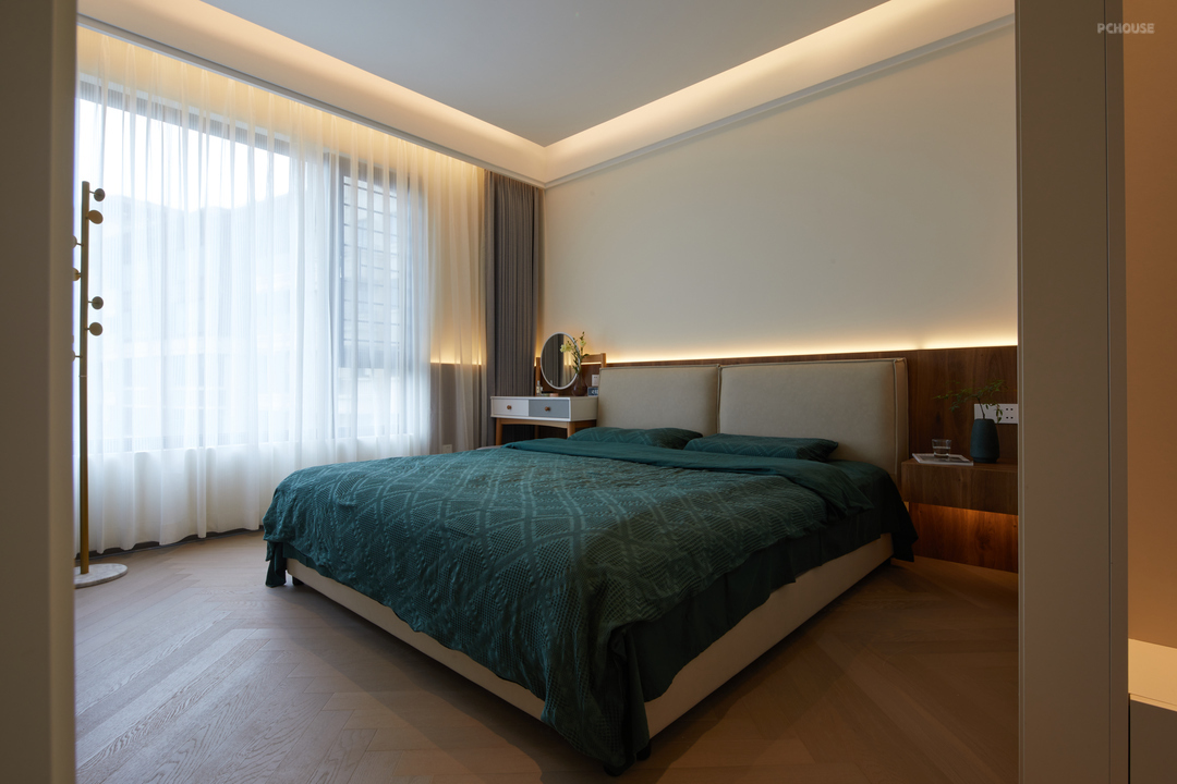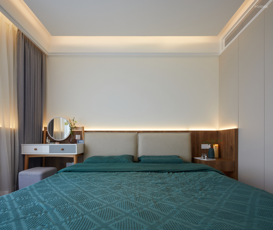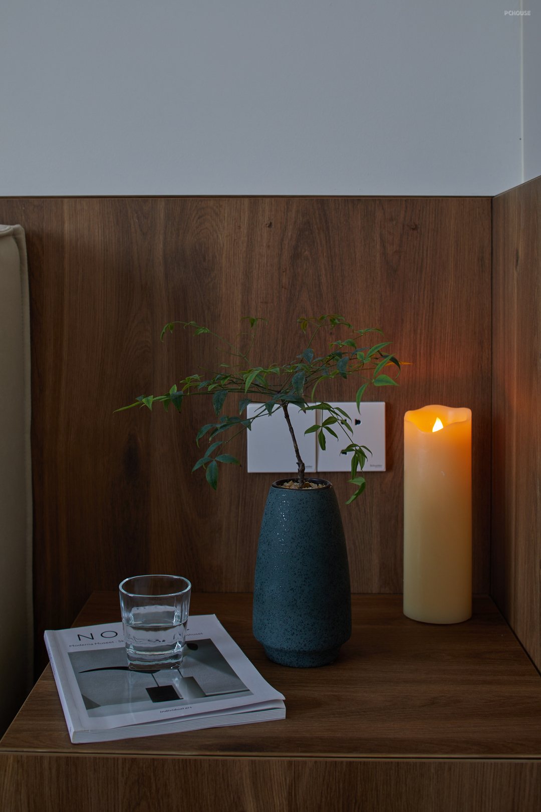 前段时间全网爆火的卧室背景墙设计,床头半墙背景+隐藏灯带,营造见光不见灯的效果,半墙使用木饰面材质,原木纹理更有森林质感。高级墨绿色的被子在自己的主卧,拥有不被定义的风格。绿植与烛台的结合,好像春回大地既有黎明的曙光,又有生机勃勃的绿洲。