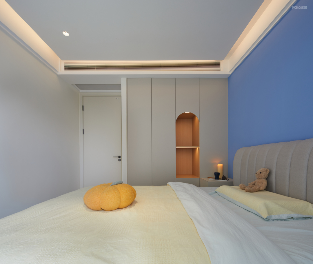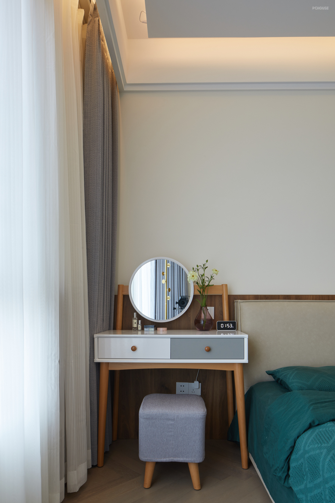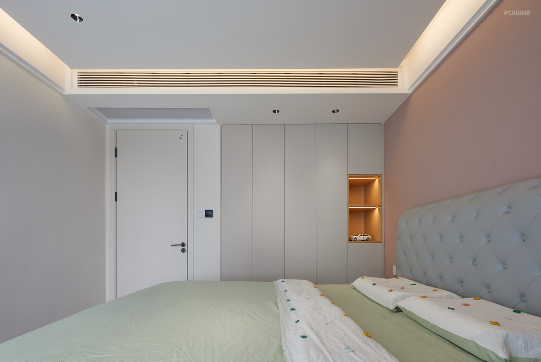 衣柜内嵌灯带,能起到小夜灯的作用。用低饱和度的粉色做大面积设计,搭配白色,温馨梦幻,长期使用也不会造成视觉疲劳。当世界都在催着你长大的同时,只有女儿房给你带来的温柔才能守住你的童话。