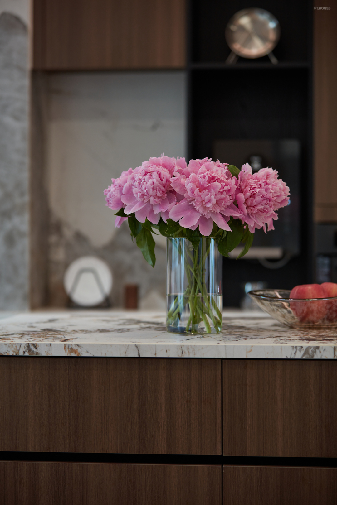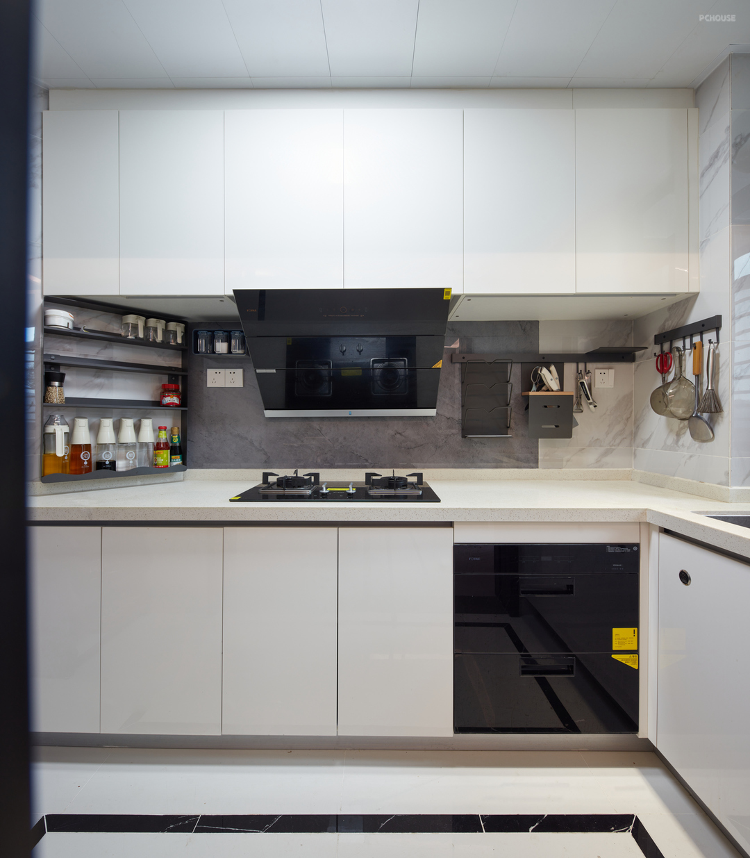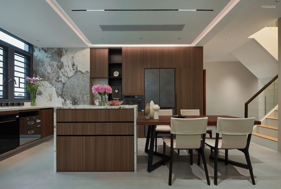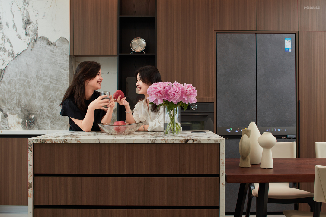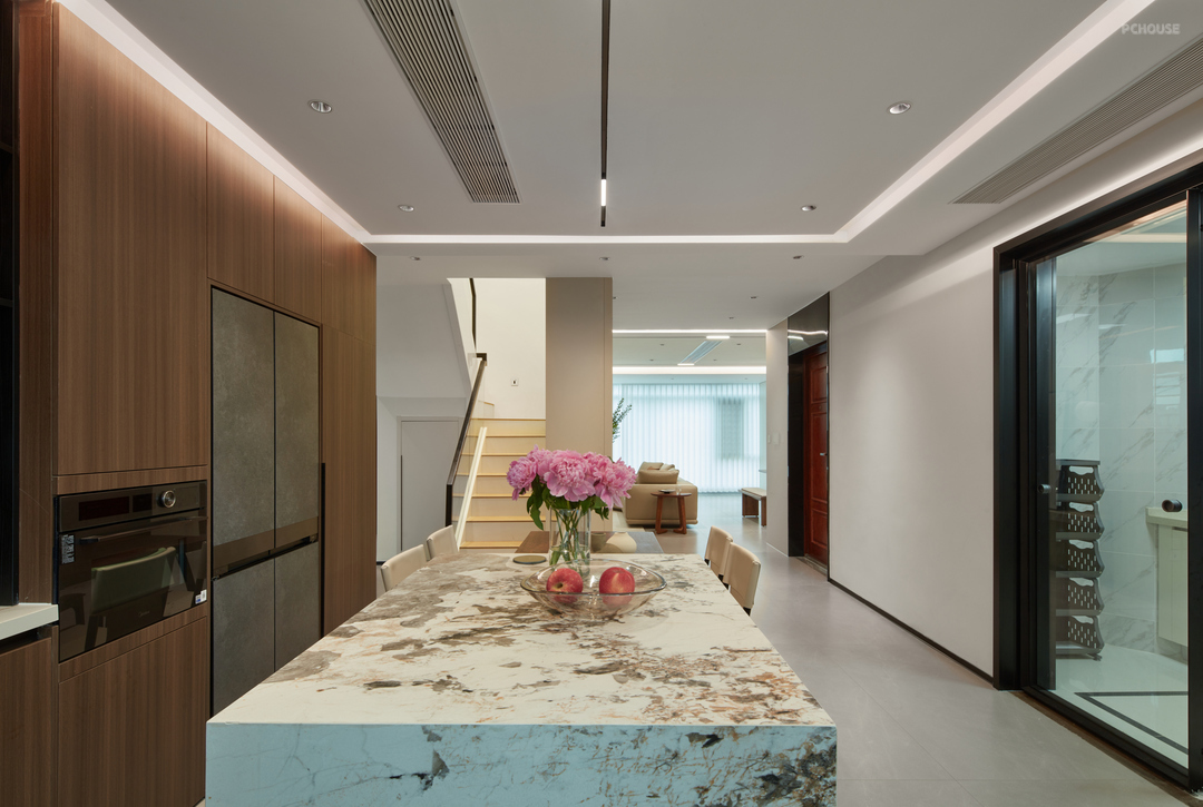 ❷ 拆除原始储物墙体,厨房分为中厨西厨两个空间,西厨岛台跟餐厅结合设计,开放式的综合功能生活区使居住者在下厨的过程中还可以与家人互动。
