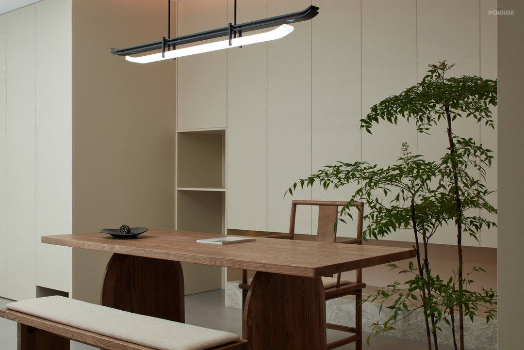 茶室区位于大横厅一角,自然原木元素的台面,营造生机盎然又充满禅意气息~充满暖意的杏色乳胶漆,毫不费力的清雅惬意,天花板独特的无主灯造型,层次感十足!靠墙一组收纳柜,底部悬浮留空强调轻盈感,灯带的烘托下,增添几分艺术氛围!