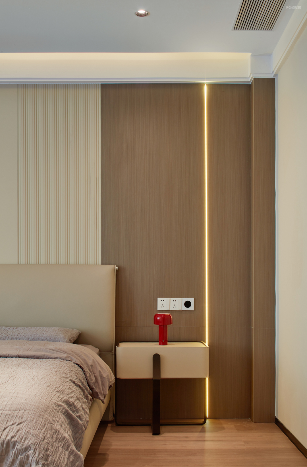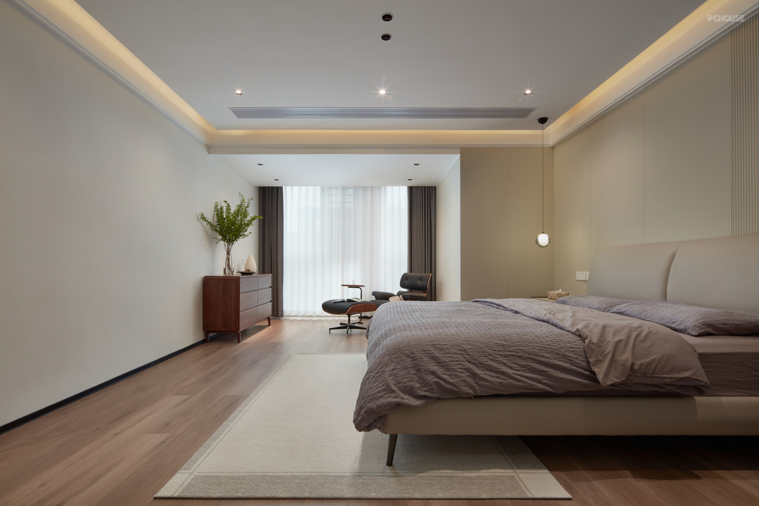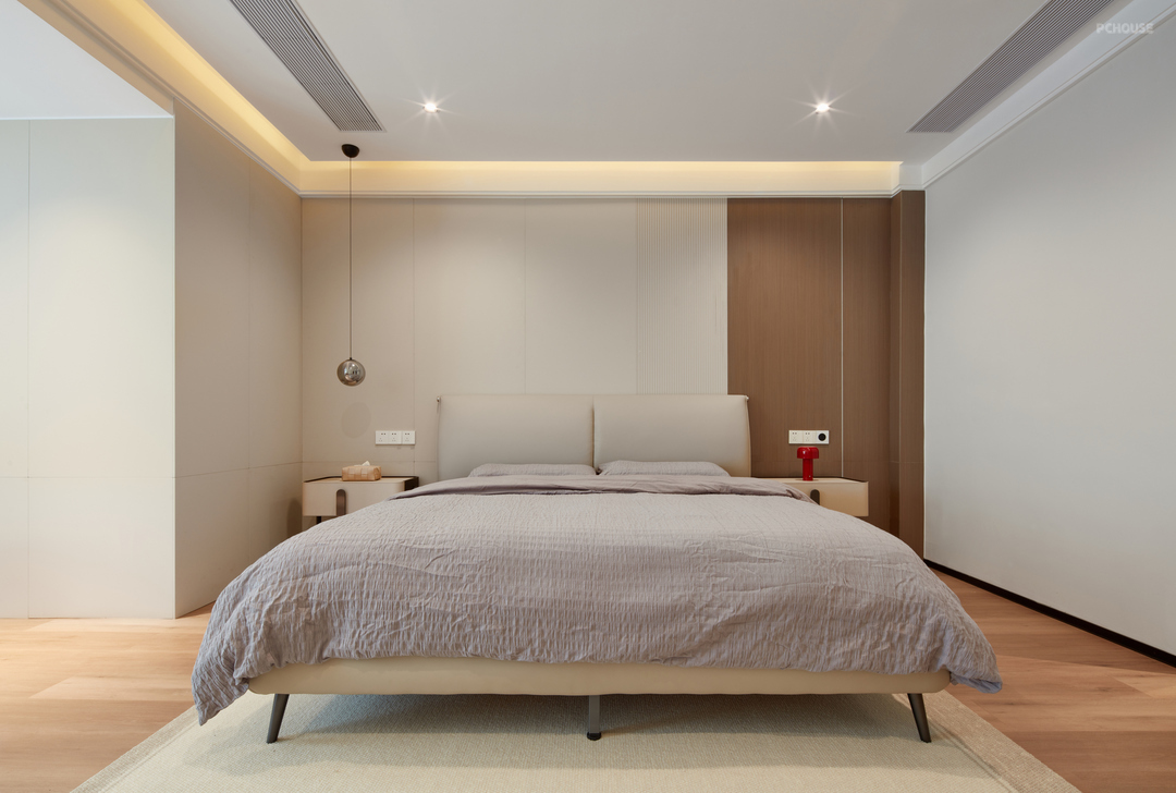 主卧背景墙是米兰护墙板+格栅+木饰面+LED灯线,可以让整个布局显得更高端大气与温馨。简约风格的卧室灯光设计以简单明亮为主,大部分都是会选择无主灯设计,加上小吊灯衬托床头灯,可以让卧室更加有格调。