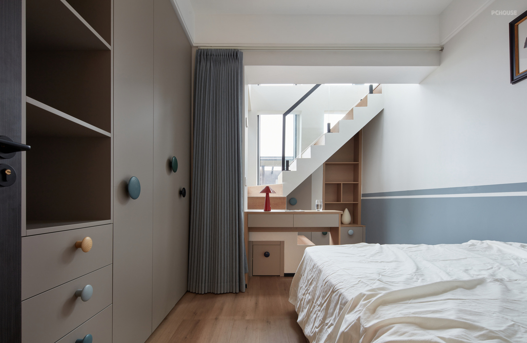 男孩房的楼梯转角处,我们做了一面柜体,同时采用抽屉、双开门和开放格展示柜的方式来完成设计。男孩房的空间位置是布局中最交织重叠的思考,设计师巧妙的来内筑空间,为小小男子汉实现一方自在天地的氛围而呈现。
