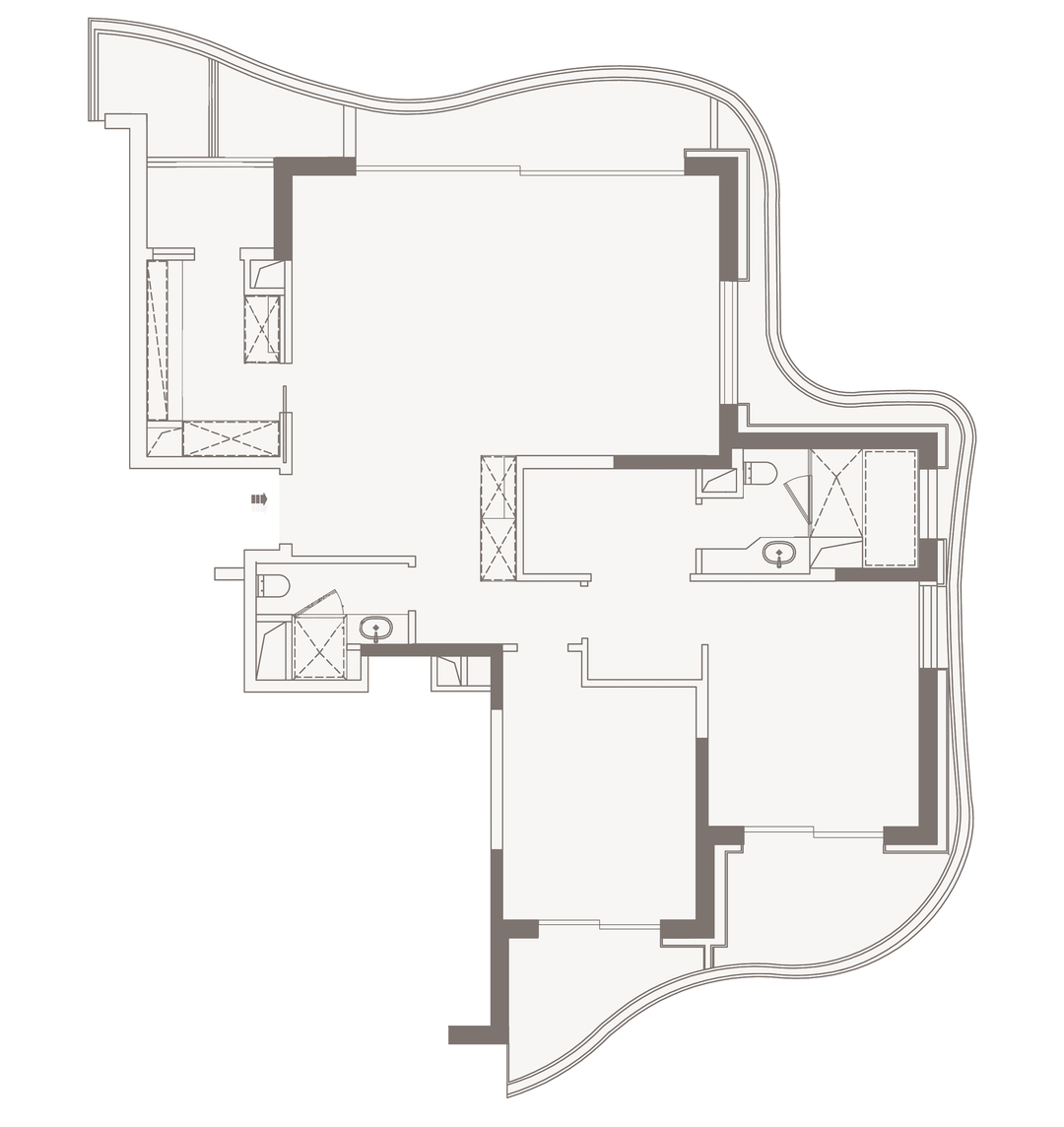 本案,位于陆家嘴·九庐,160㎡大平层,两房的现代精装交付标准不太能满足四口之家的需求。屋主希望在尽量避免拆改厨卫的基础上做设计。