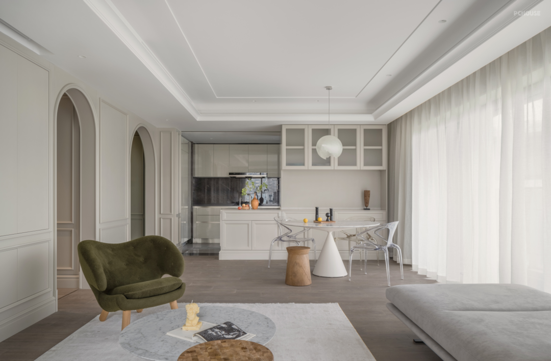 现代法式与浪漫时尚的温柔搭配,奶白色与淡雅绿的清新相遇,细腻柔和的基调与克制线条的雅致融合,打造了高级感&时尚经典的客餐厅空间。
