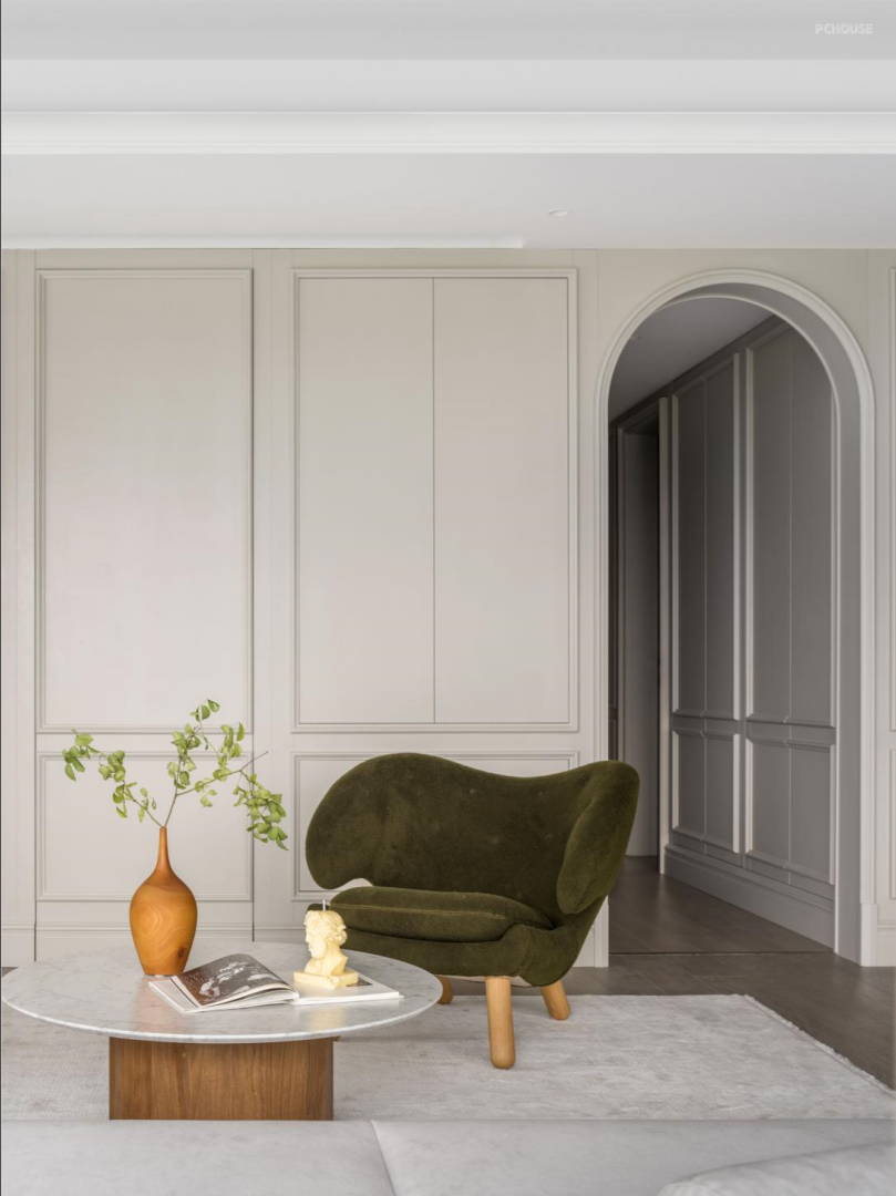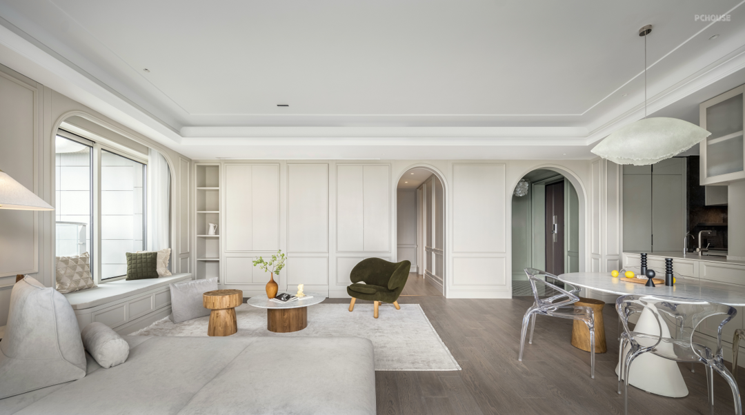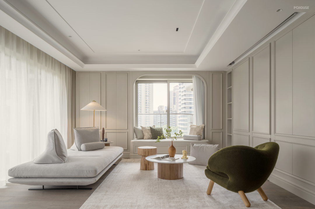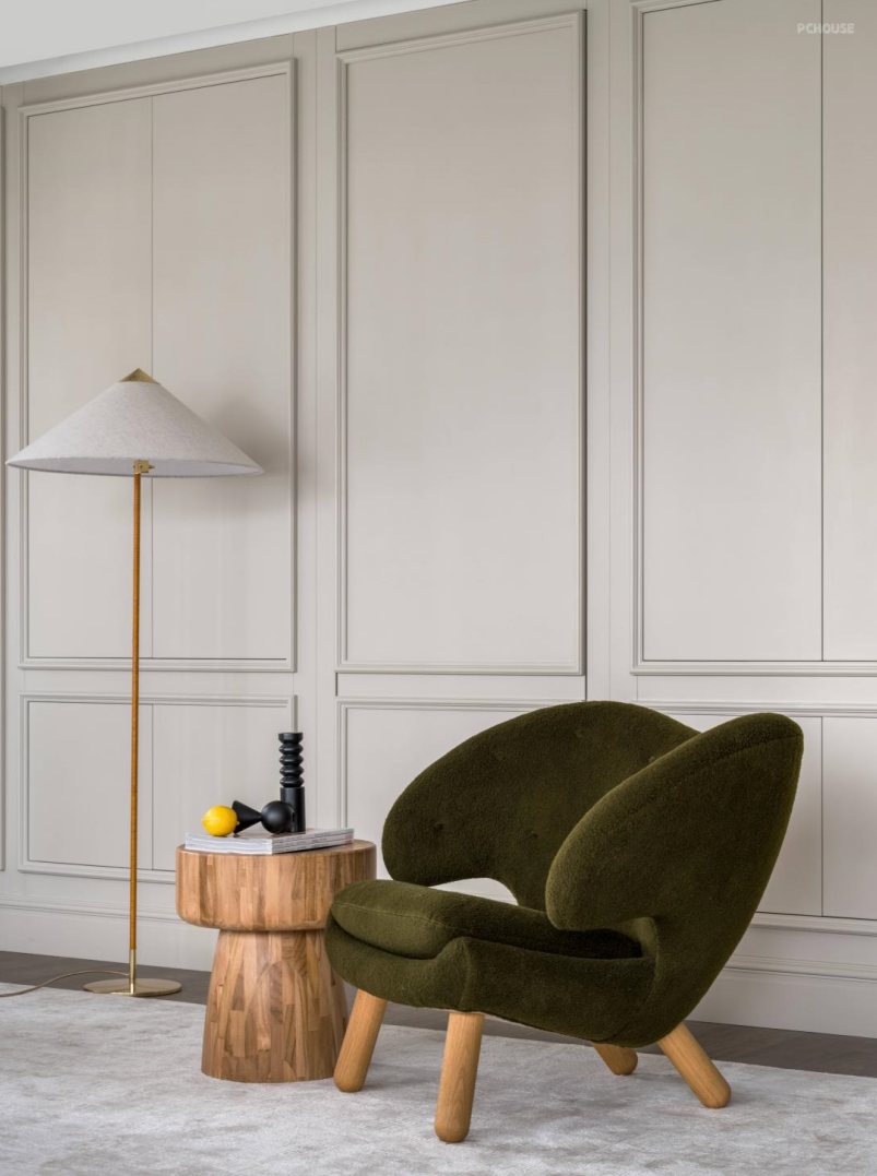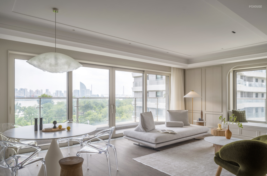 Linge Roset 多元化主沙发,满足屋主几代人的生活方式,可灵活移动位置的靠背,实现生活场景化的多种可能,既可以调整方向欣赏江景或追剧娱乐,也可以躺着小憩。Finn Juhl单椅,融合卡座,客厅围合式氛围感立现。