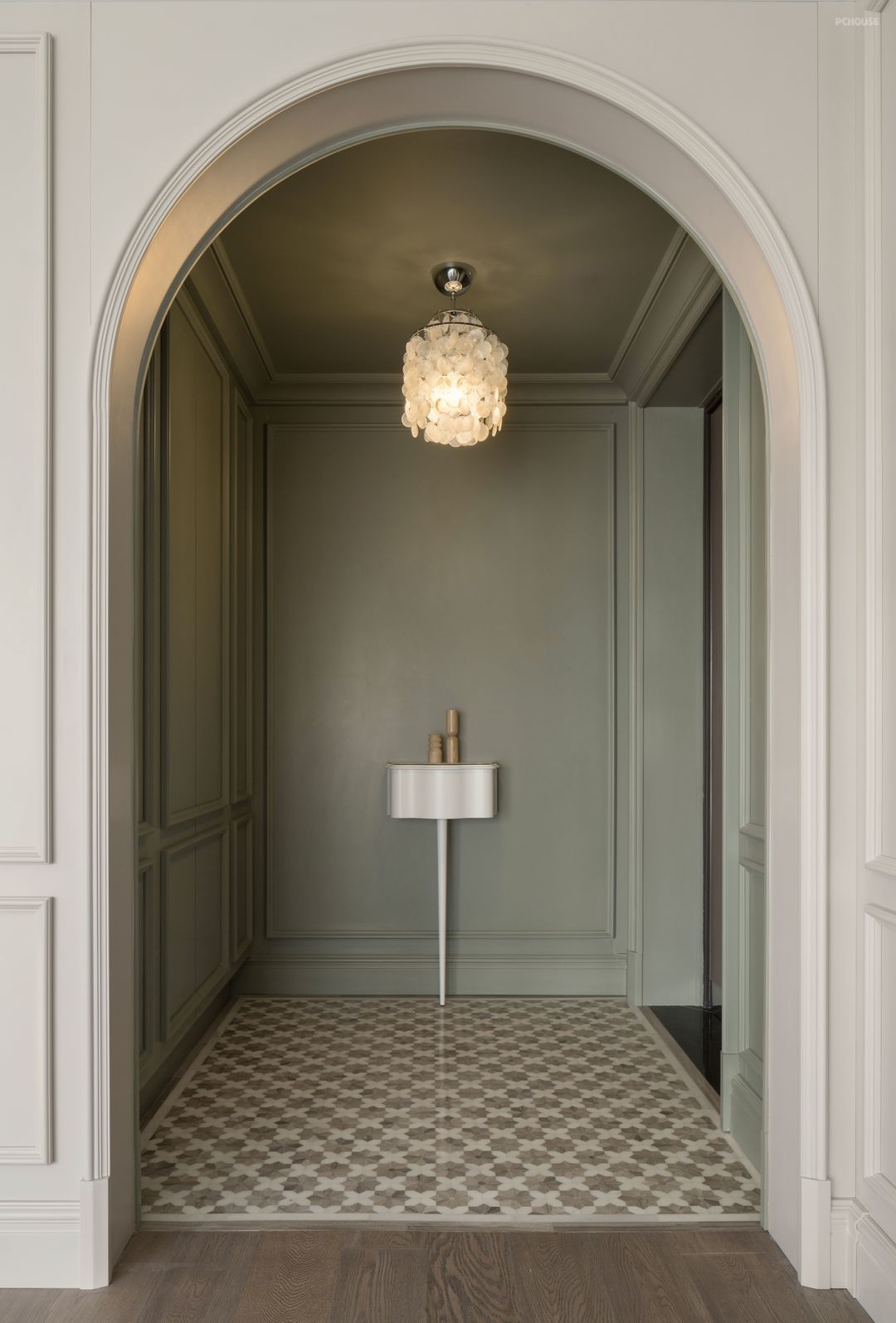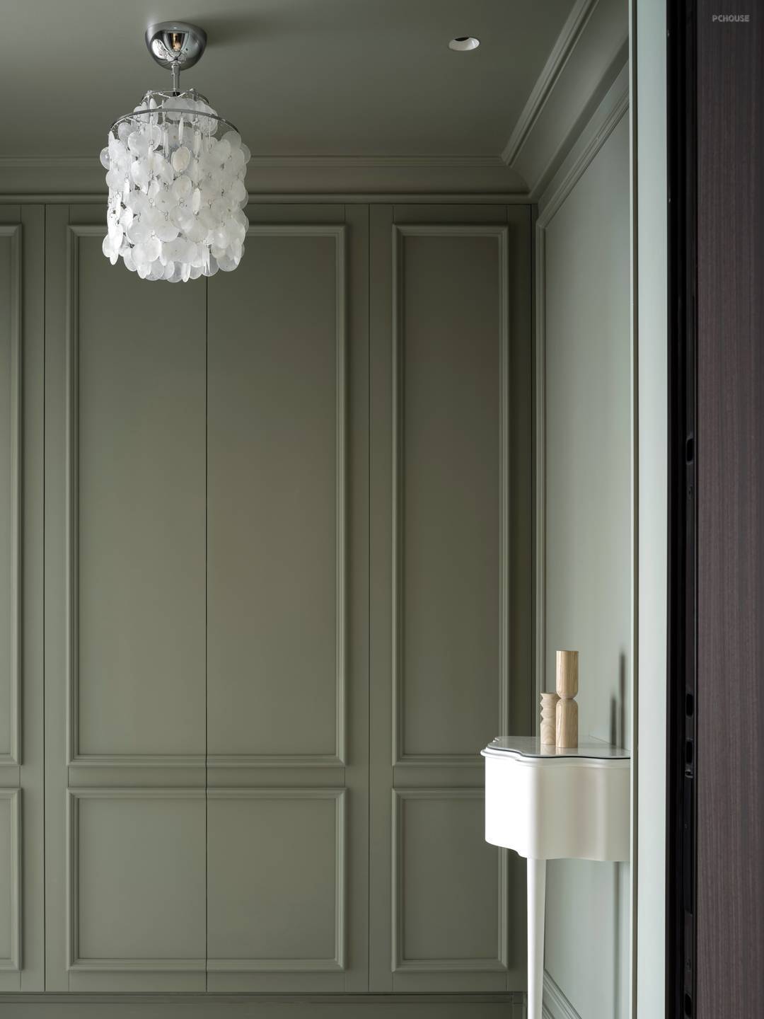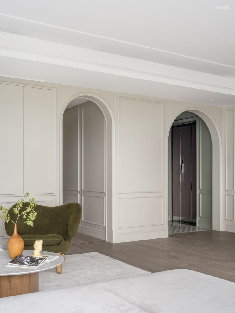 逐一拆解时空的脉络,将藏艺带入空间。拱形门连接玄关与走道,客厅视角下,是“别有洞天”的景观区。隐藏式收纳与绿色系的组合,给人焕然一新之感。