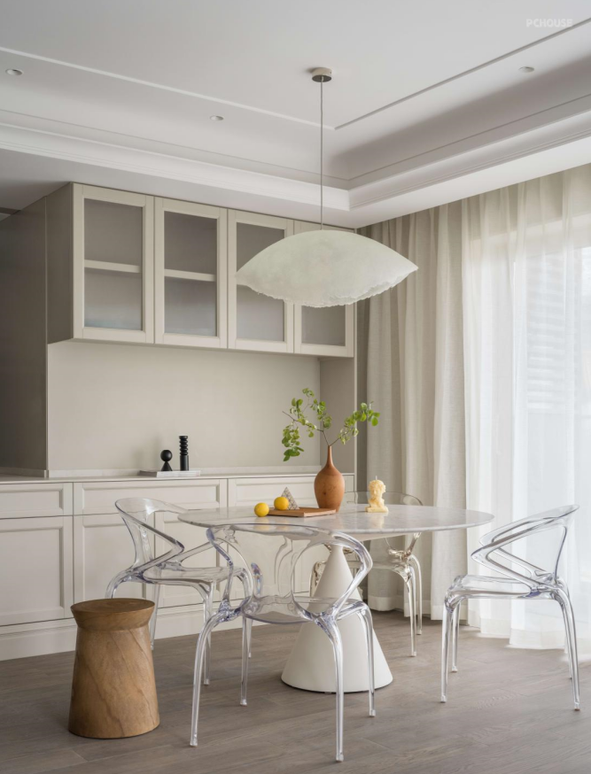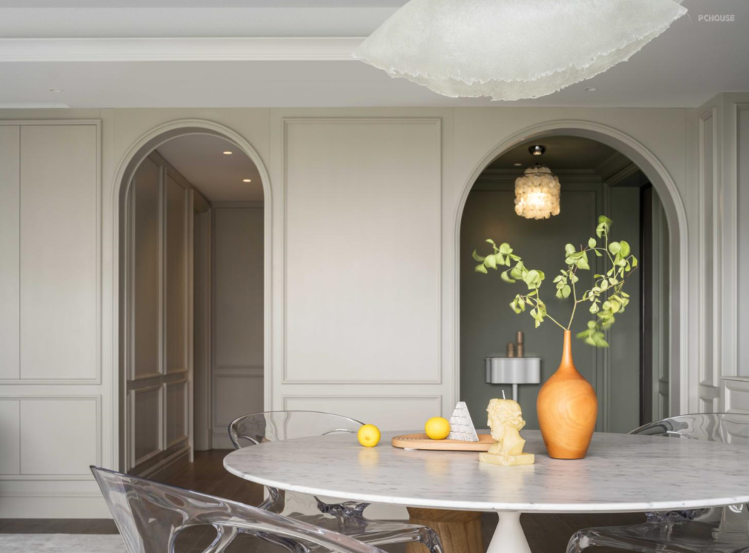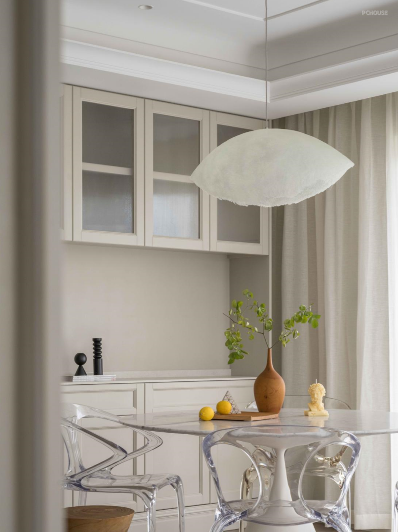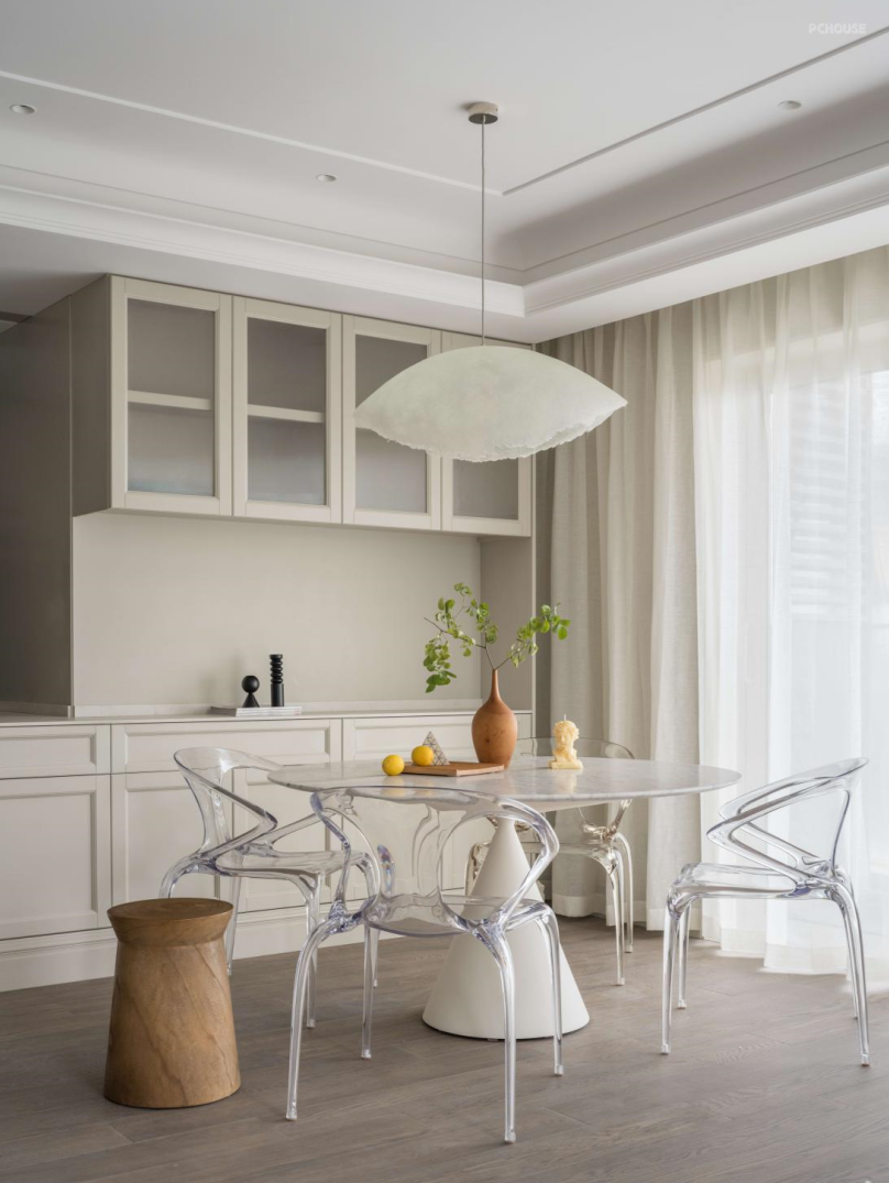 现代摩登别致的造型,感受着简单的美感,经典大理石餐桌Agapecasa 搭配极具未来感的Roche Bobois 透明圈椅,赋予空间丰富的定义与深度。