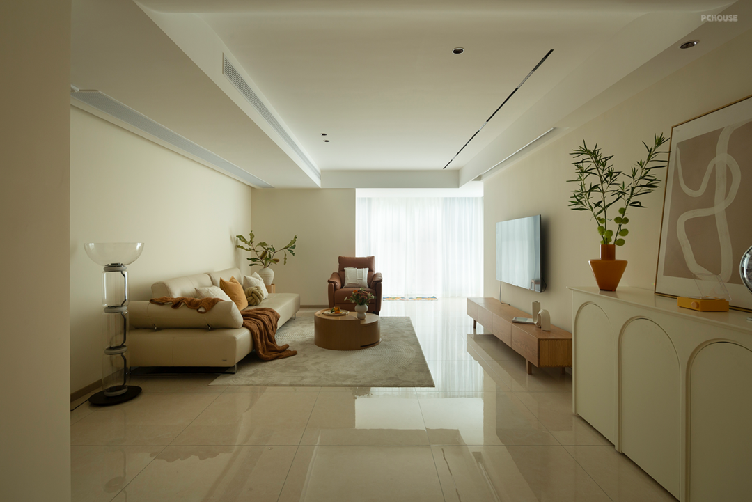 延续对灵动美感一以贯之的捕捉与表现,也反复考量日常生活的舒适度和视觉体验,设计师将一根横亘在客餐厅上方的梁进行了弧线处理,在底部嵌入灯槽,连贯的形与影延伸至走廊深处,抵达私密空间。