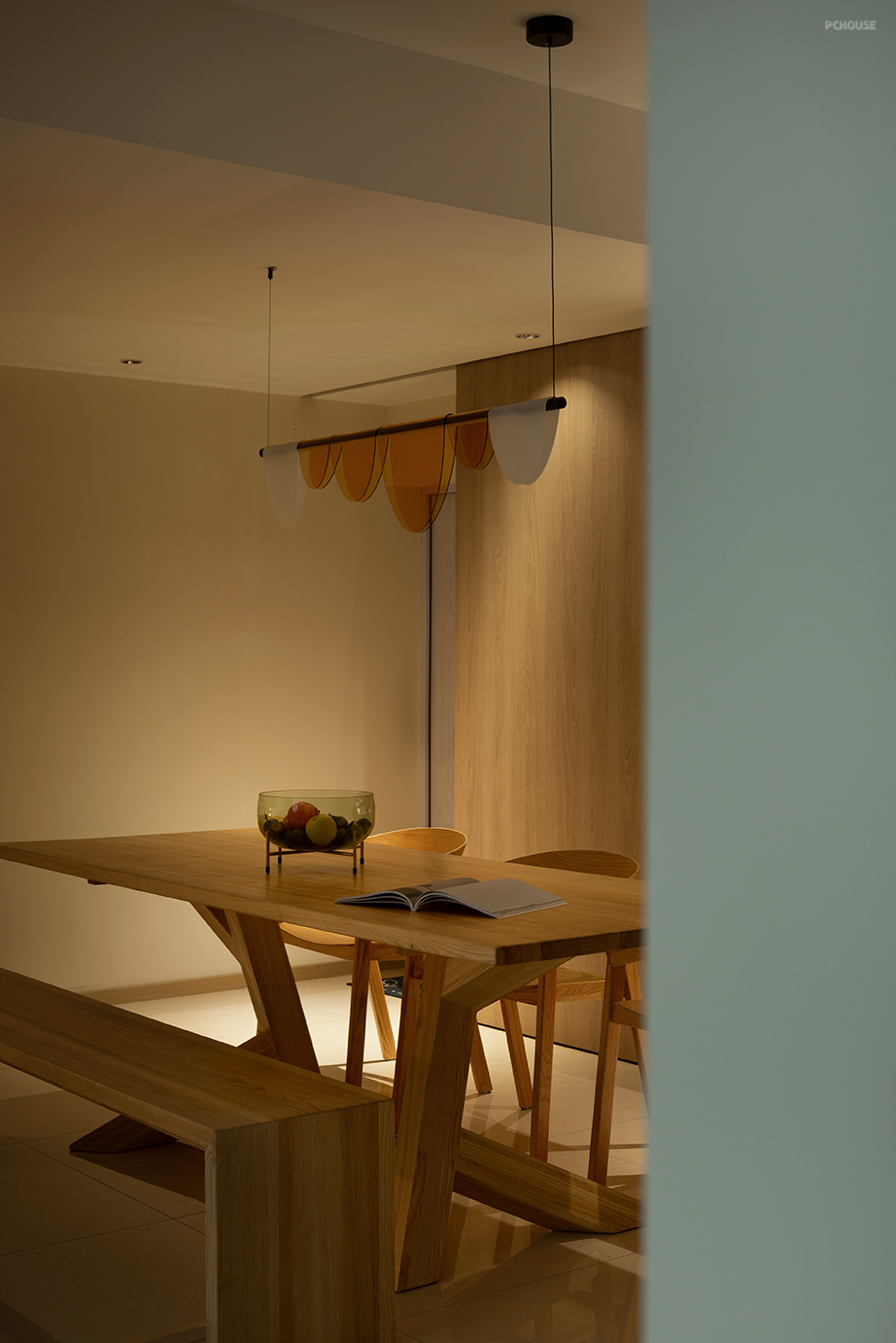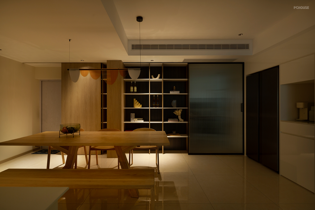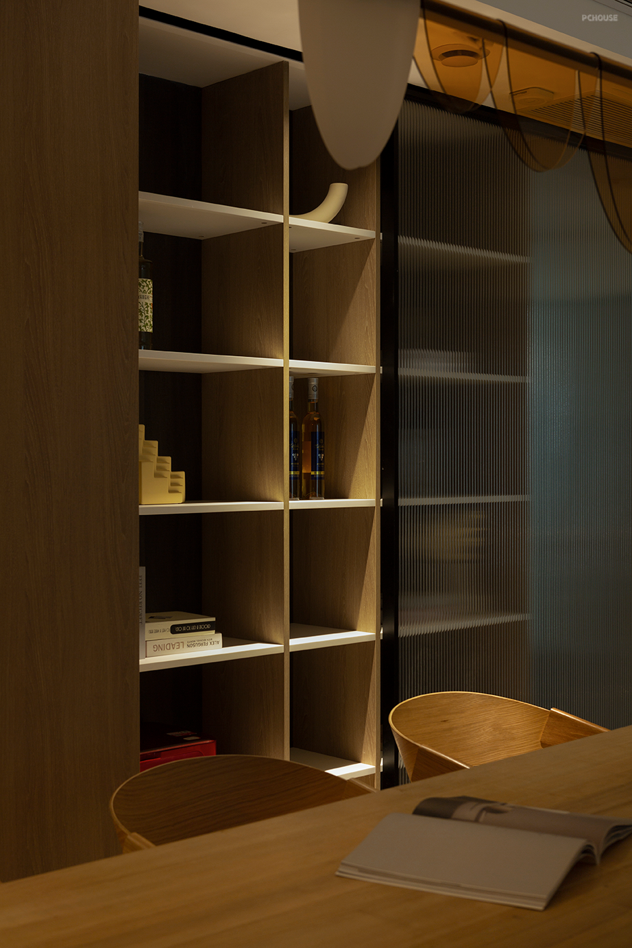 餐厅是采光欠佳的区域,于是设计师利用空间结构上的这一缺陷,营造出空间上含蓄、清幽的气质。以长虹玻璃兼顾柜体门和厨房推拉门,引入来自厨房区域的补光,加以暖色的灯光,恰好以柔和的姿态中和满墙柜体带来的硬朗感。