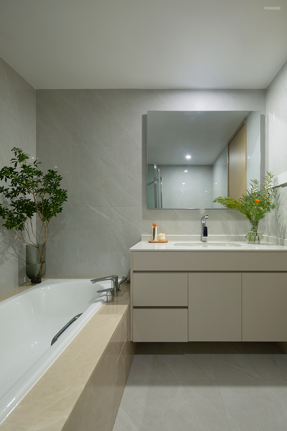 卫生间区域主要做了符合业主生活习惯的干湿分区,因为对浴缸的需求较大,所以将马桶区、淋浴区进行合理组合,在符合生活习惯的前提下,更要让空间井然有序。