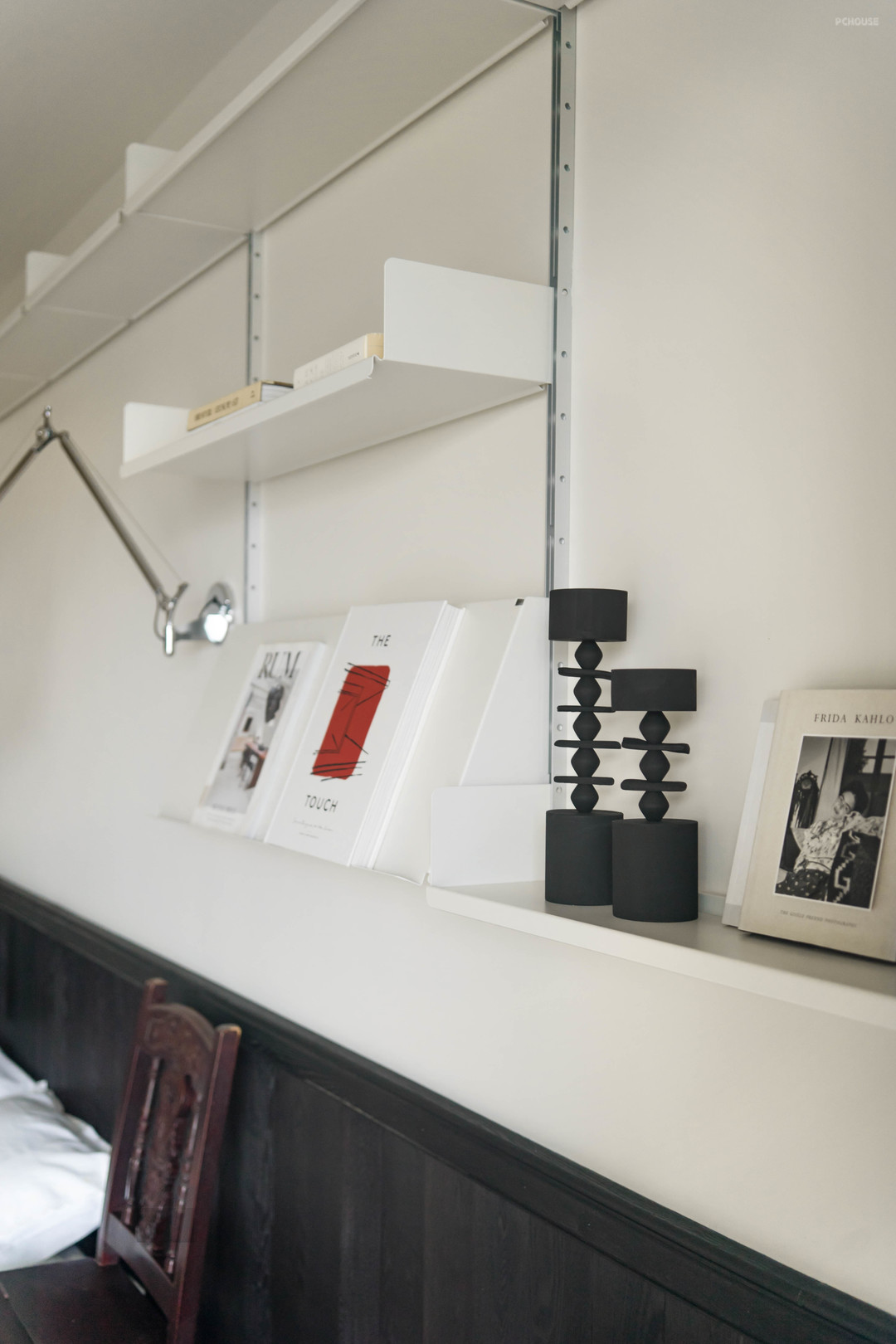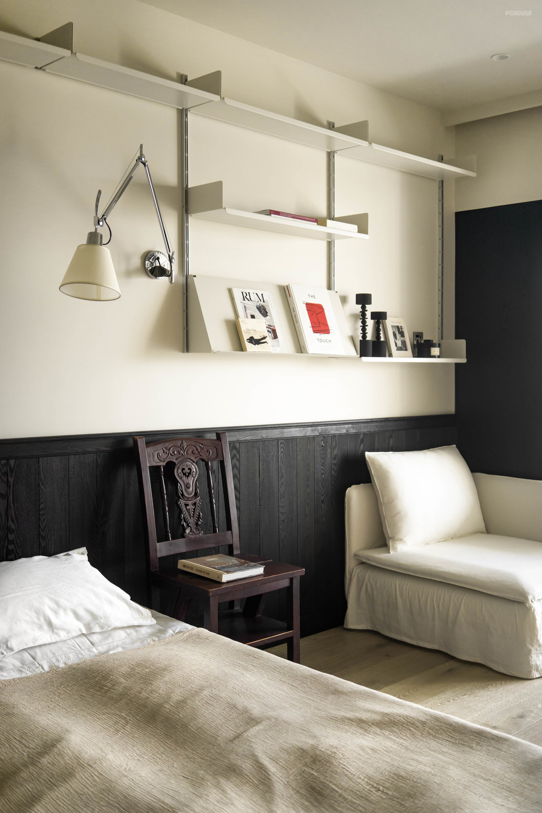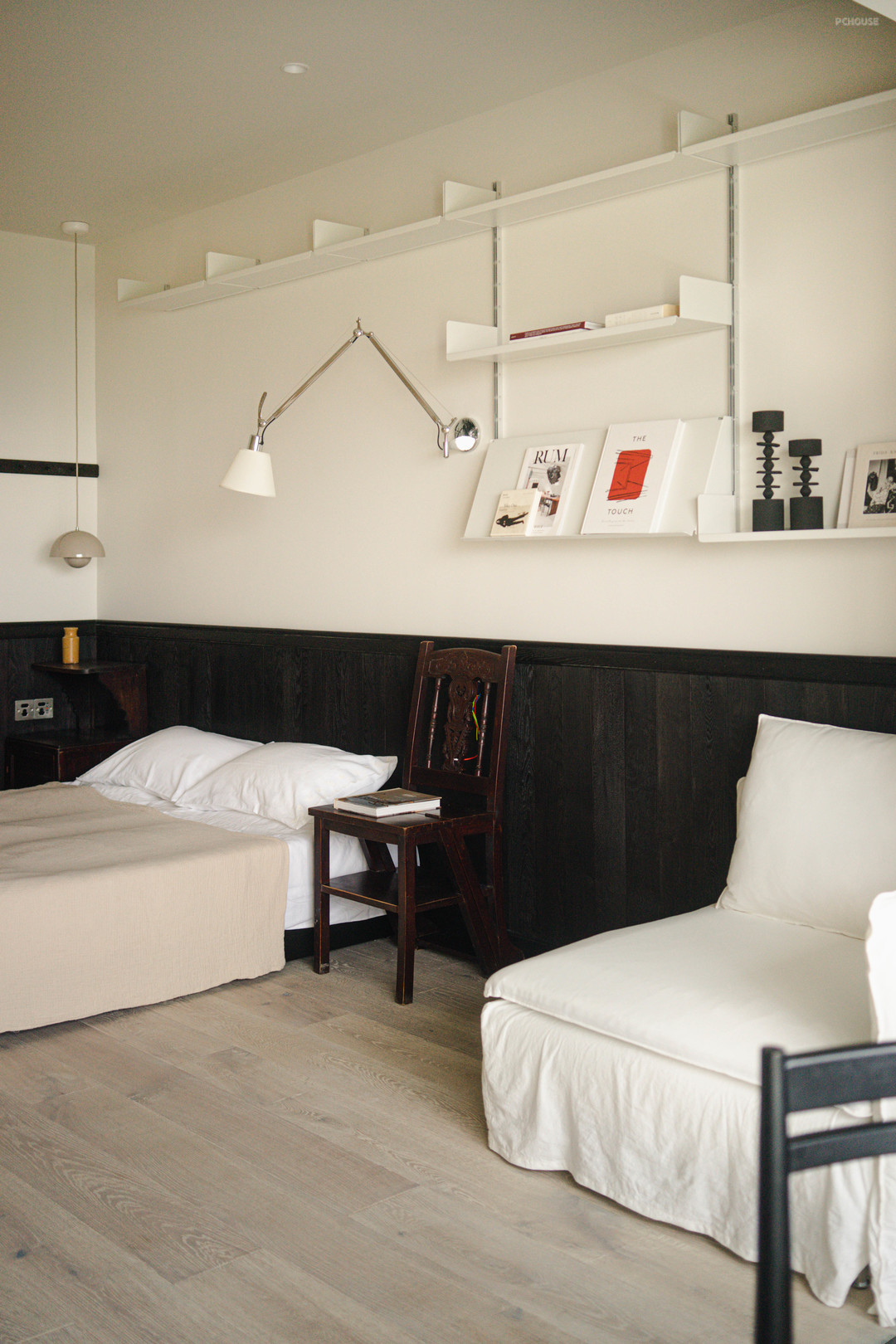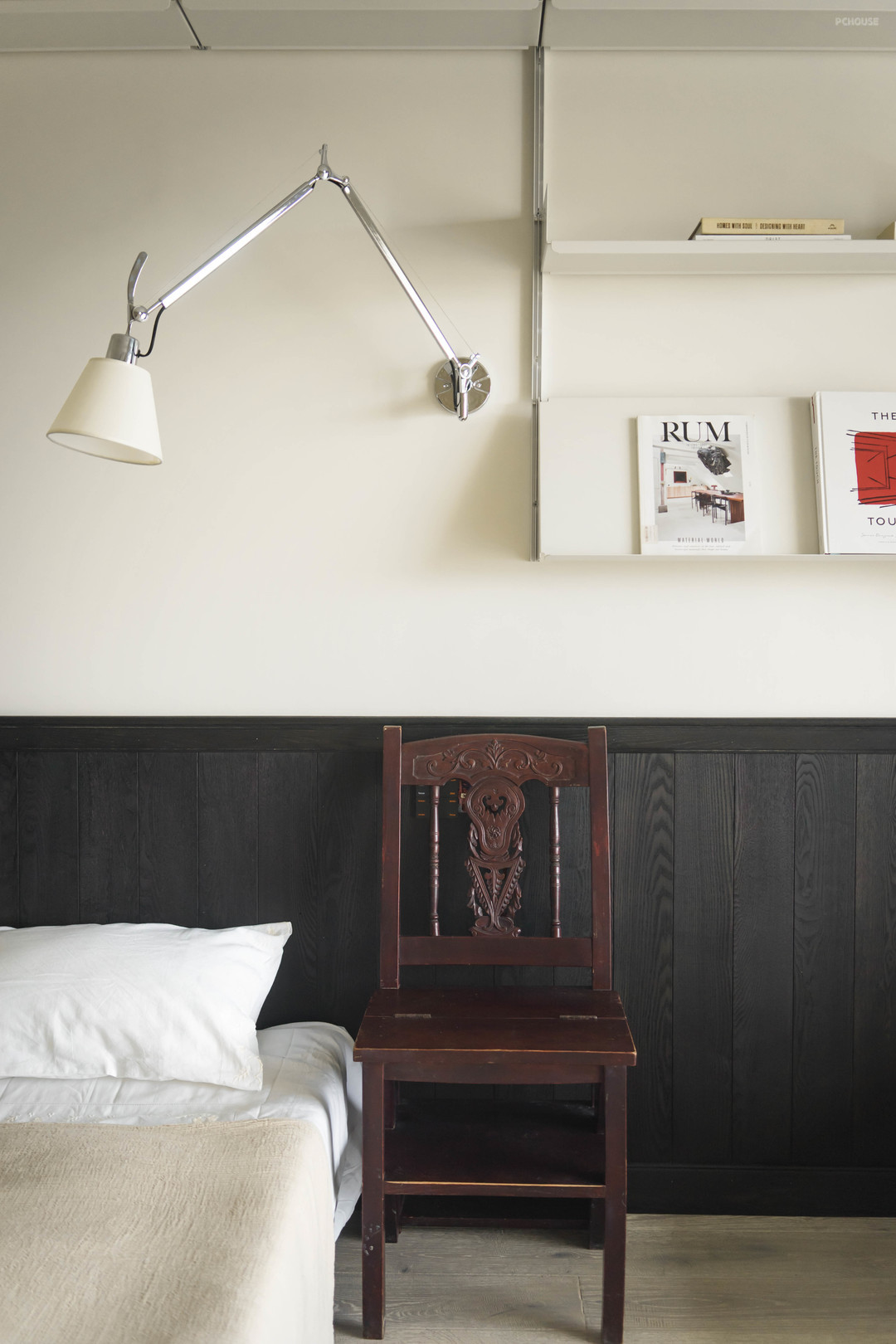 床头柜是上海淘的旧家具,搭配丹麦的经典款花苞灯,又是现代跟复古的碰撞。