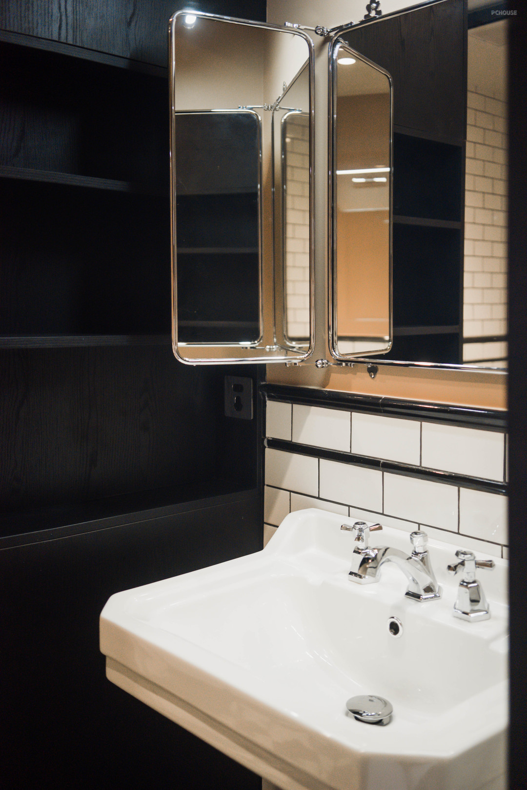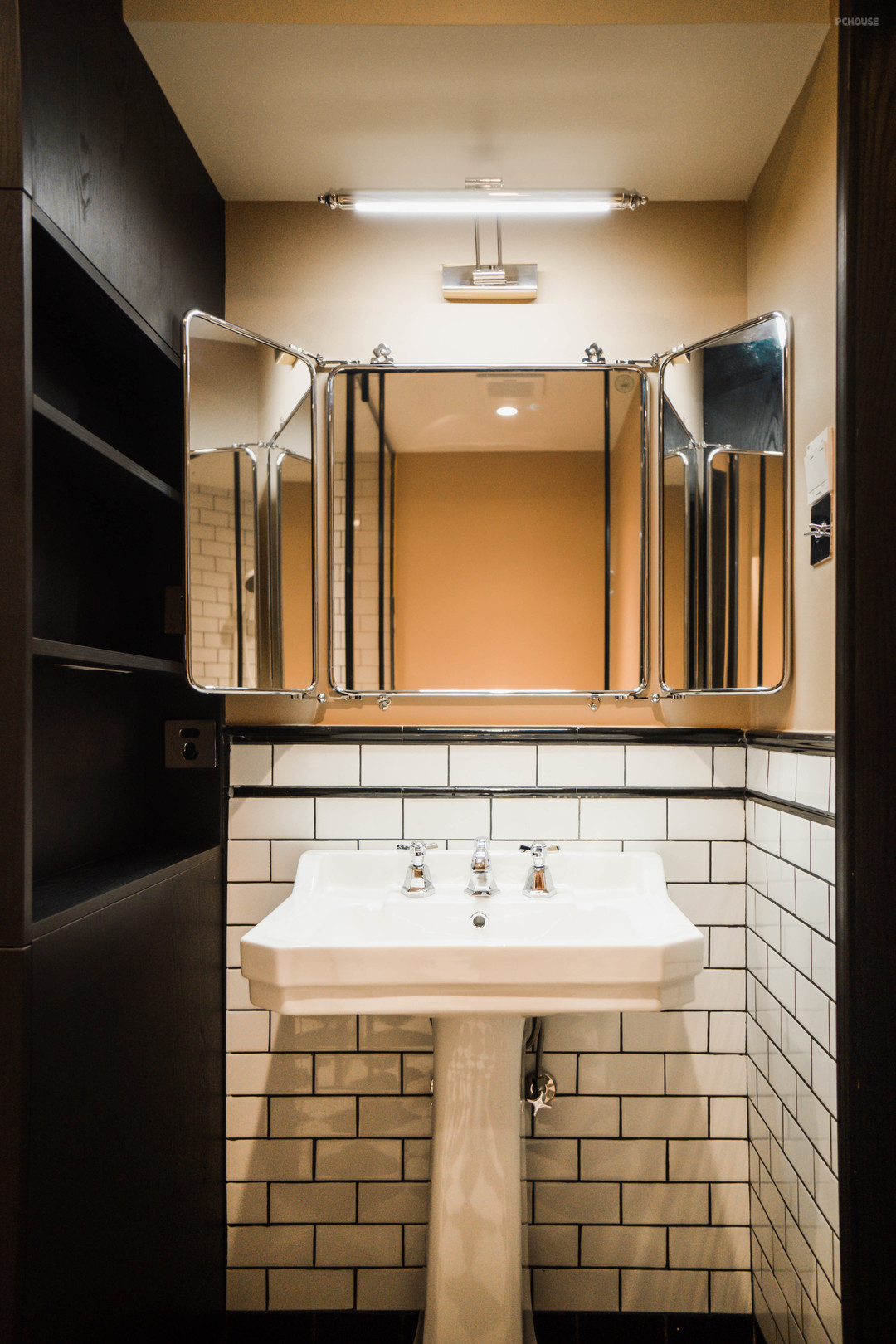 满满复古感的洗手池区域!台盆是落地式,镜子是可以开合的~