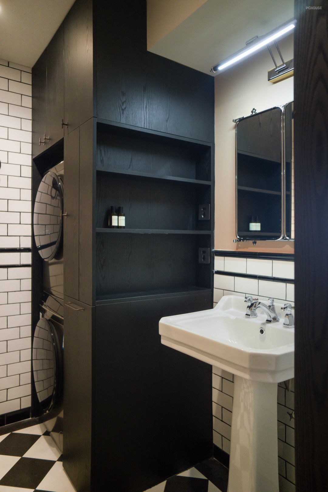 洗手池侧面洗衣机柜+收纳柜一体。充分利用小空间的每个尺寸!
