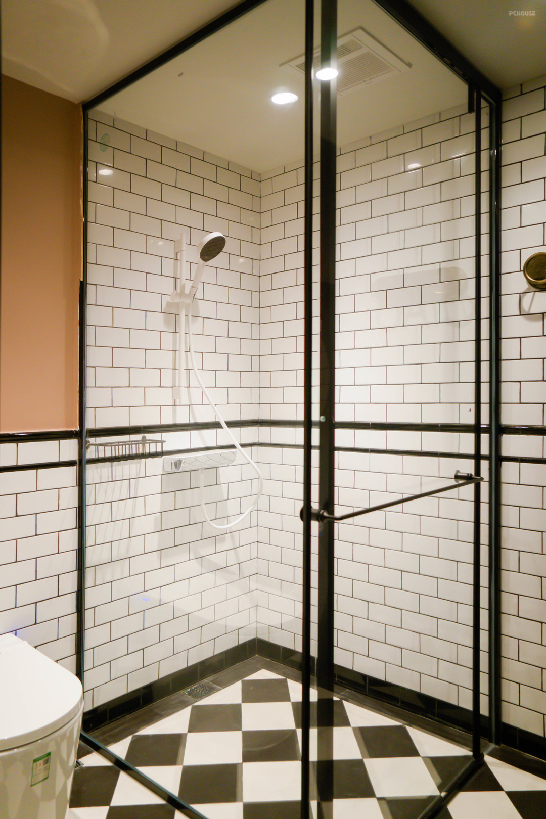 汉斯格雅的白色花洒很高级,淋浴房和马桶区隔断用的极简黑边框。