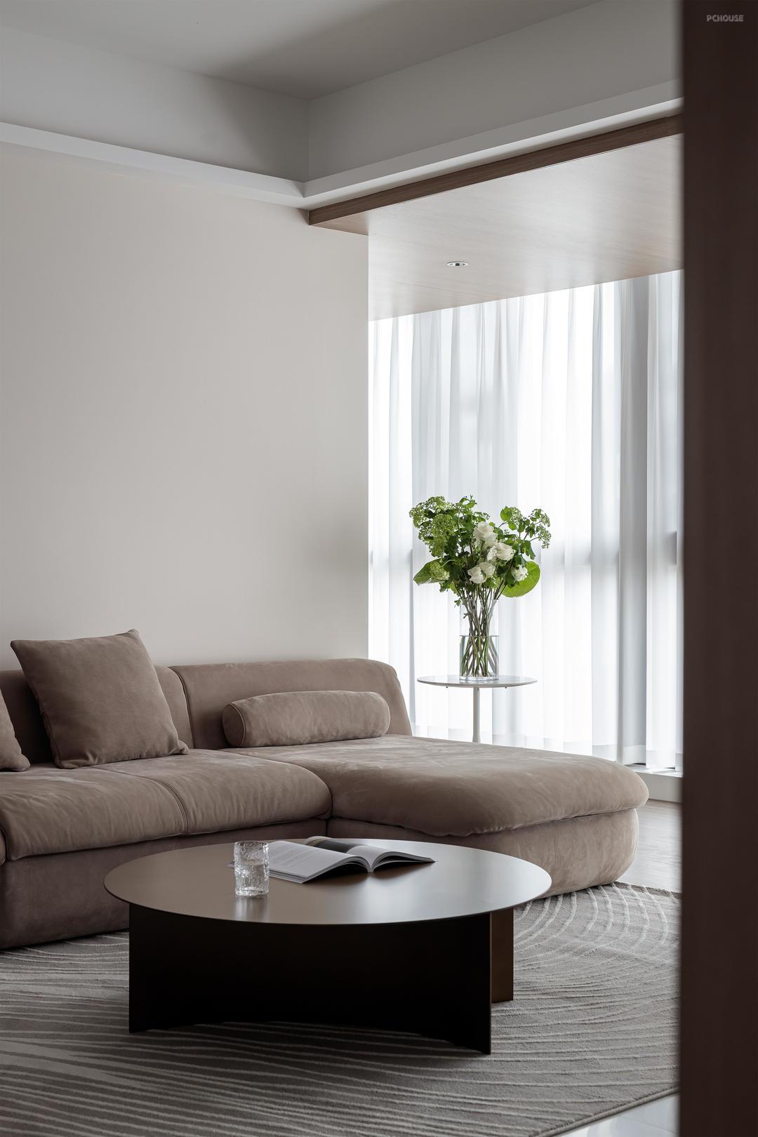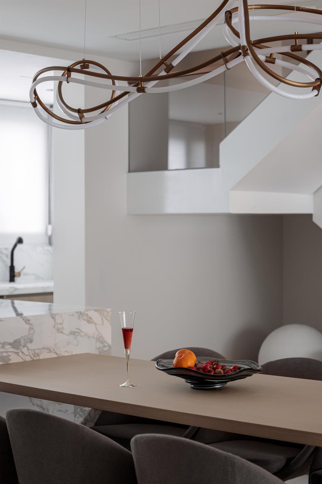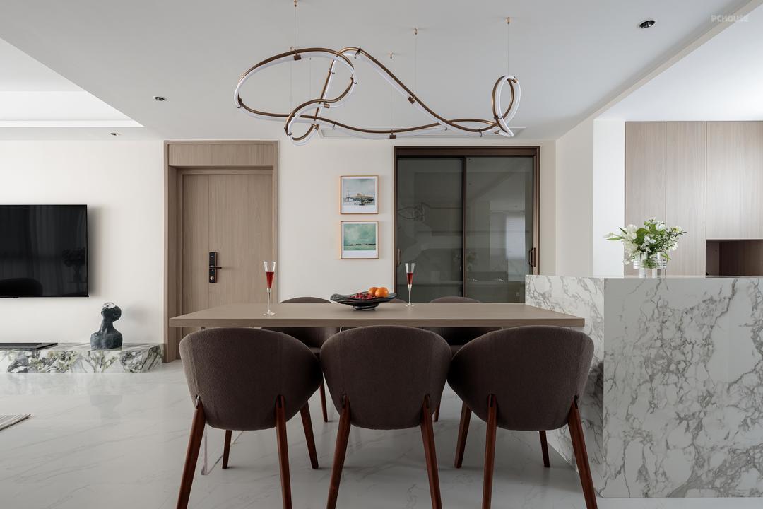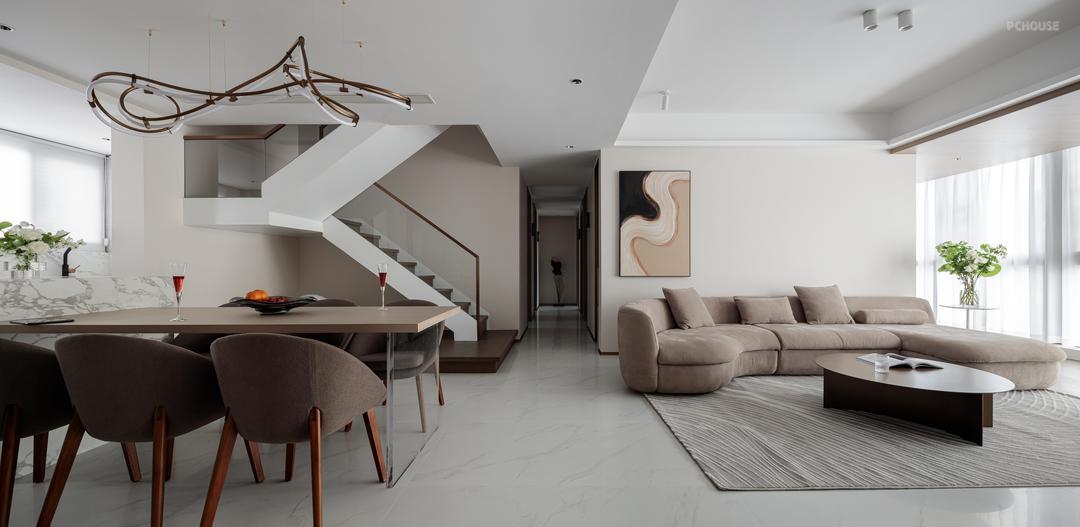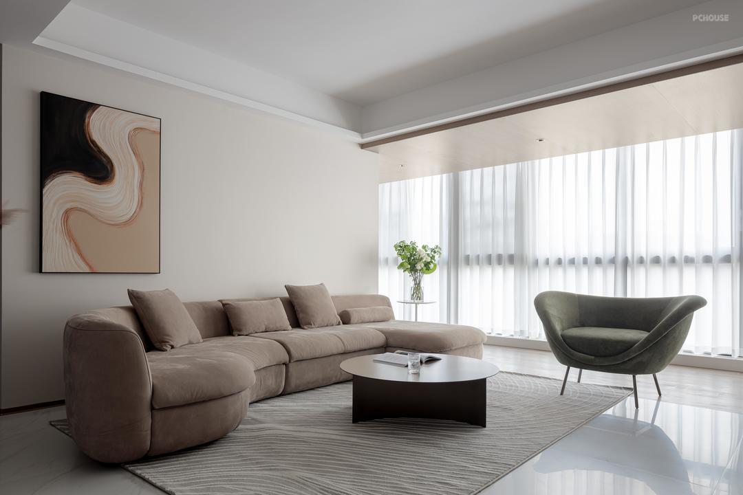 在风格方面,定位为现代风格,空间关键词为知性、优雅。以暖系浅咖色打底,灰木纹作为主体家具背景色,带有艺术气息的,弧线型的家具、软装,和有意思的装置艺术,在空间中徐徐展开,充分的去体现整个家的气质。